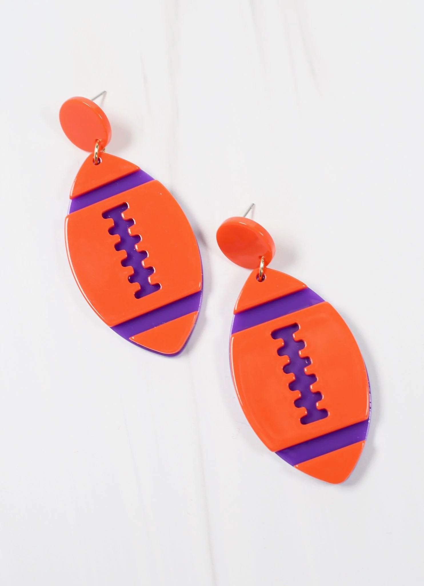 This acrylic football earring is a great accessory to complete your Game Day outfit! It has a two tone coloring on a post back.