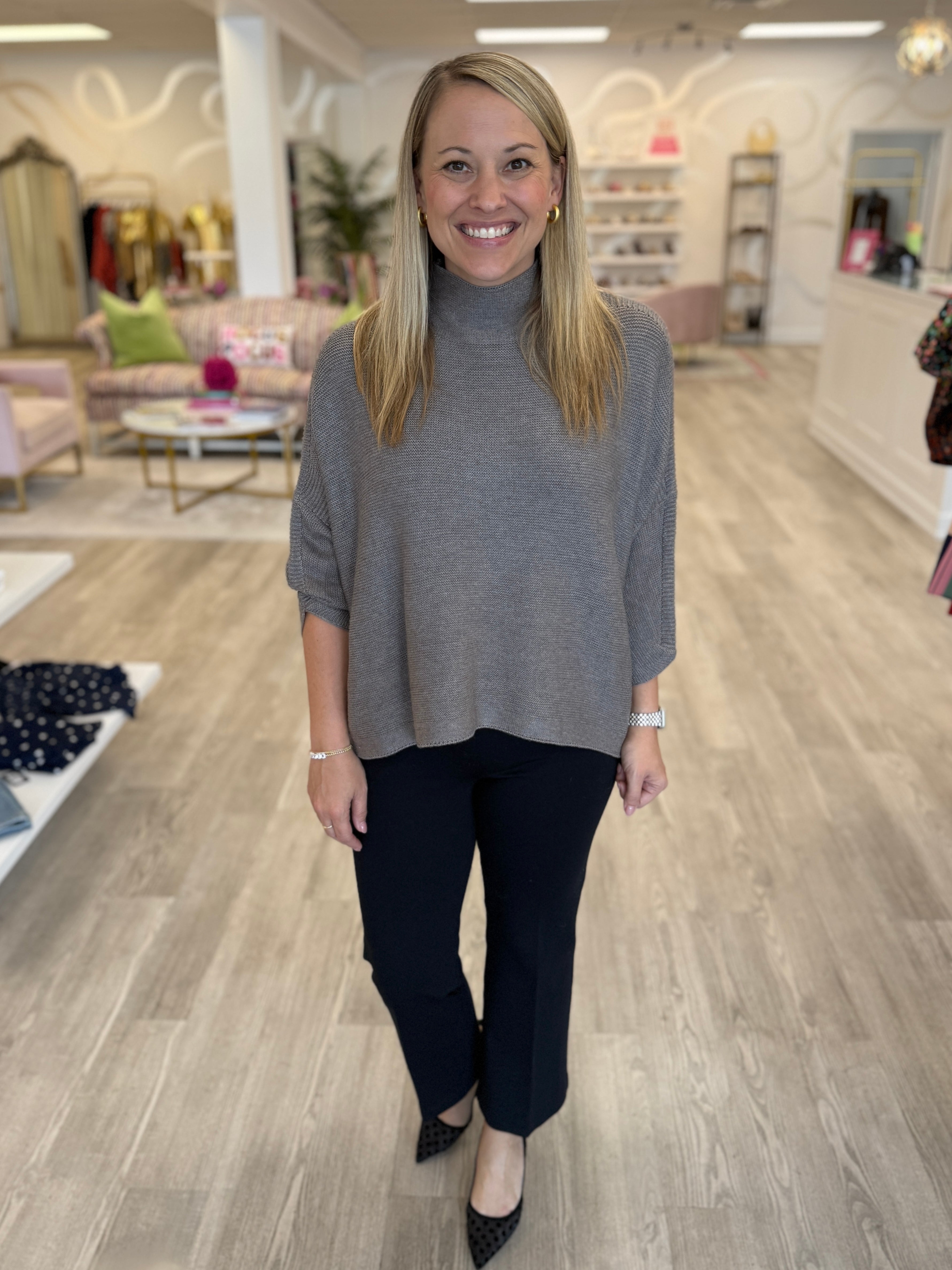 Oversized turtleneck hi/lo sweater in garter stitch with 3/4 sleeve, contrasting rib accents and side slits.