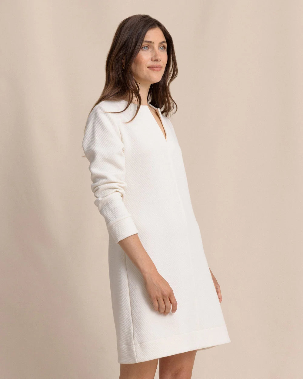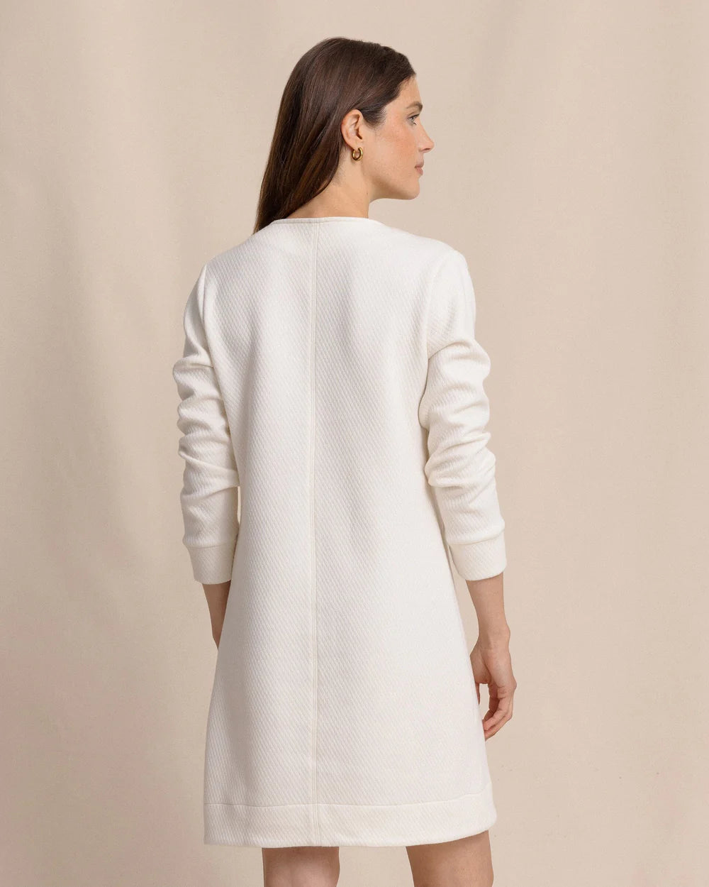 Elevate your wardrobe with the Cady Jacquard Dress — a long-sleeve silhouette defined by a subtle quilted diamond pattern that adds refined texture and dimension. Crafted for both comfort and style, it offers a flattering fit that moves effortlessly from day to evening. Perfect for cooler coastal days when sophistication meets ease.
