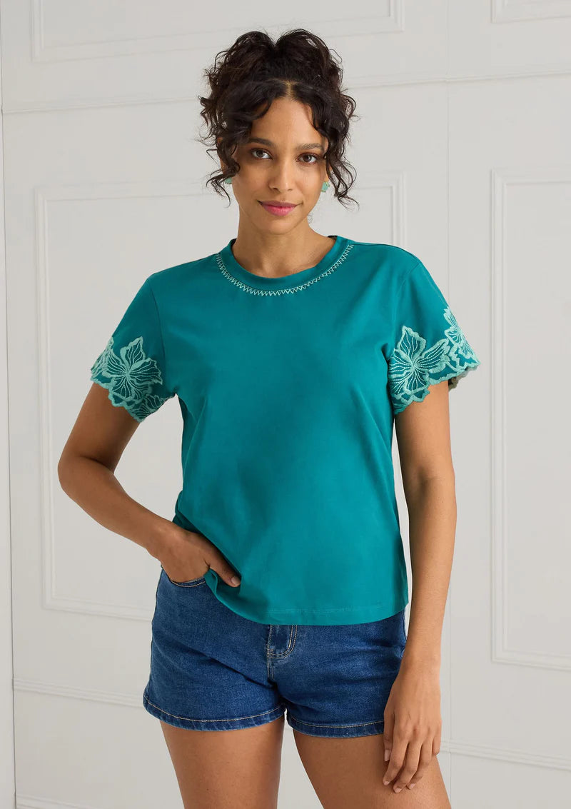 This classic tee in a relaxed silhouette features a floral embroidered scallop sleeve.