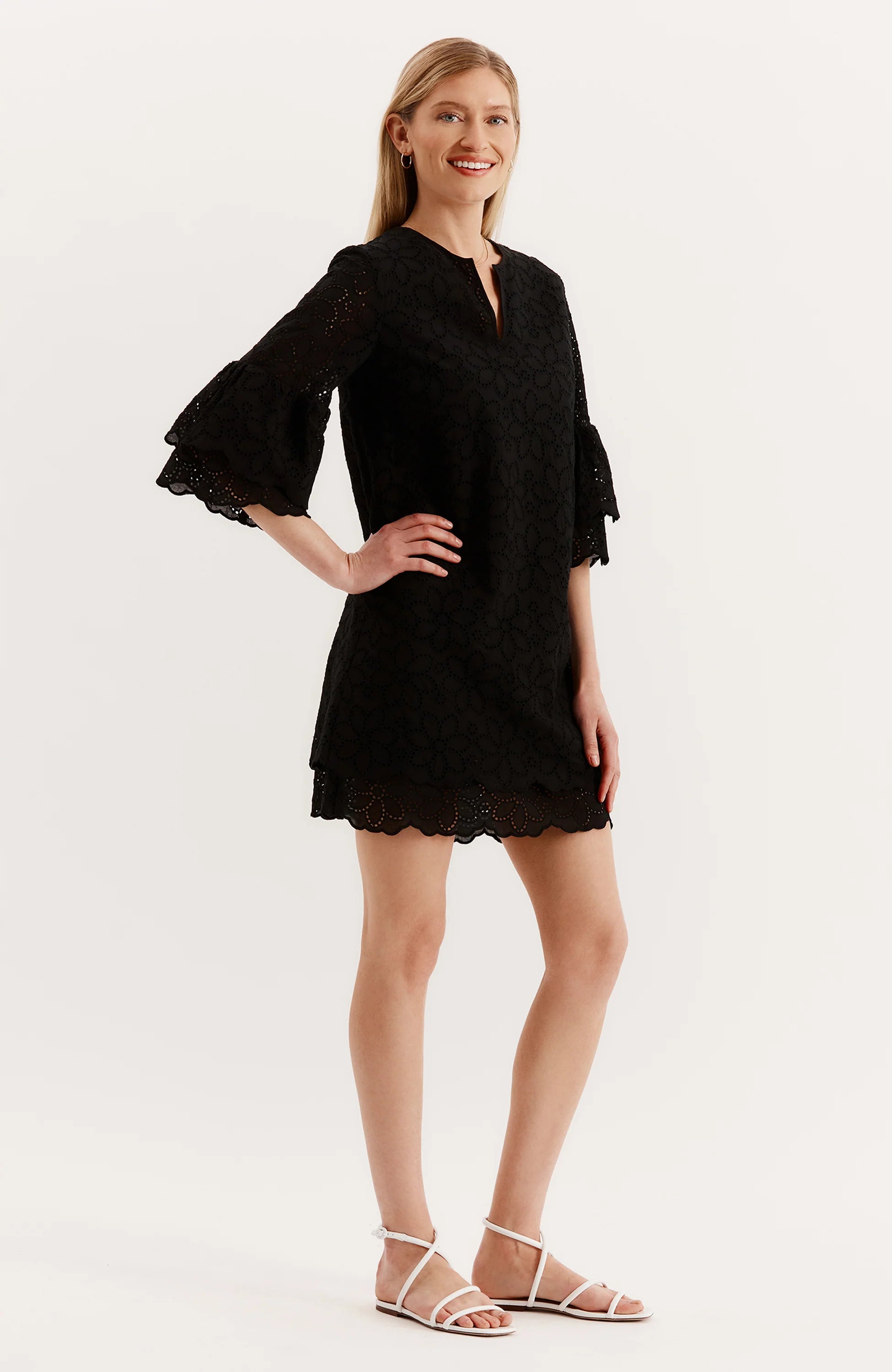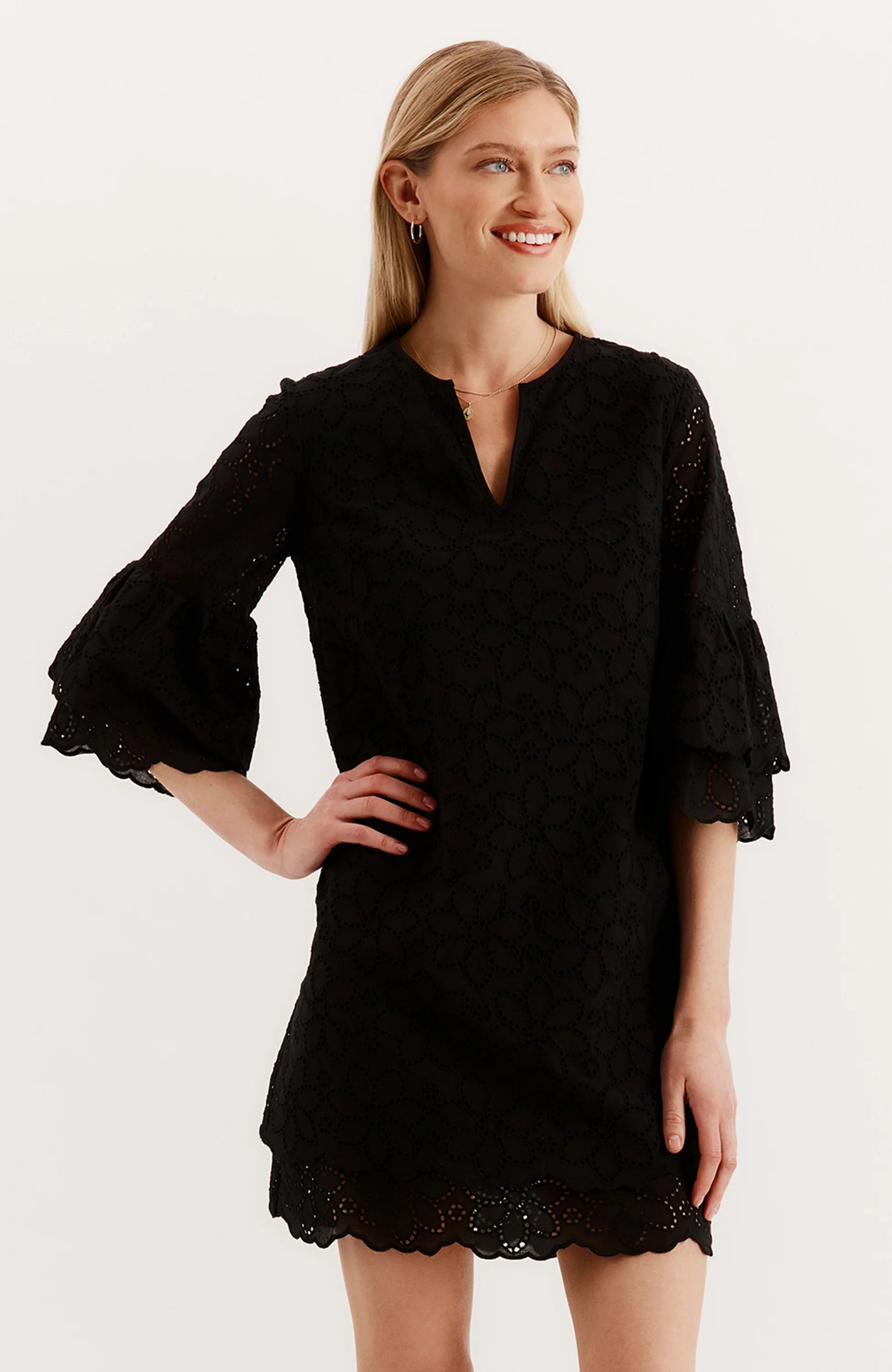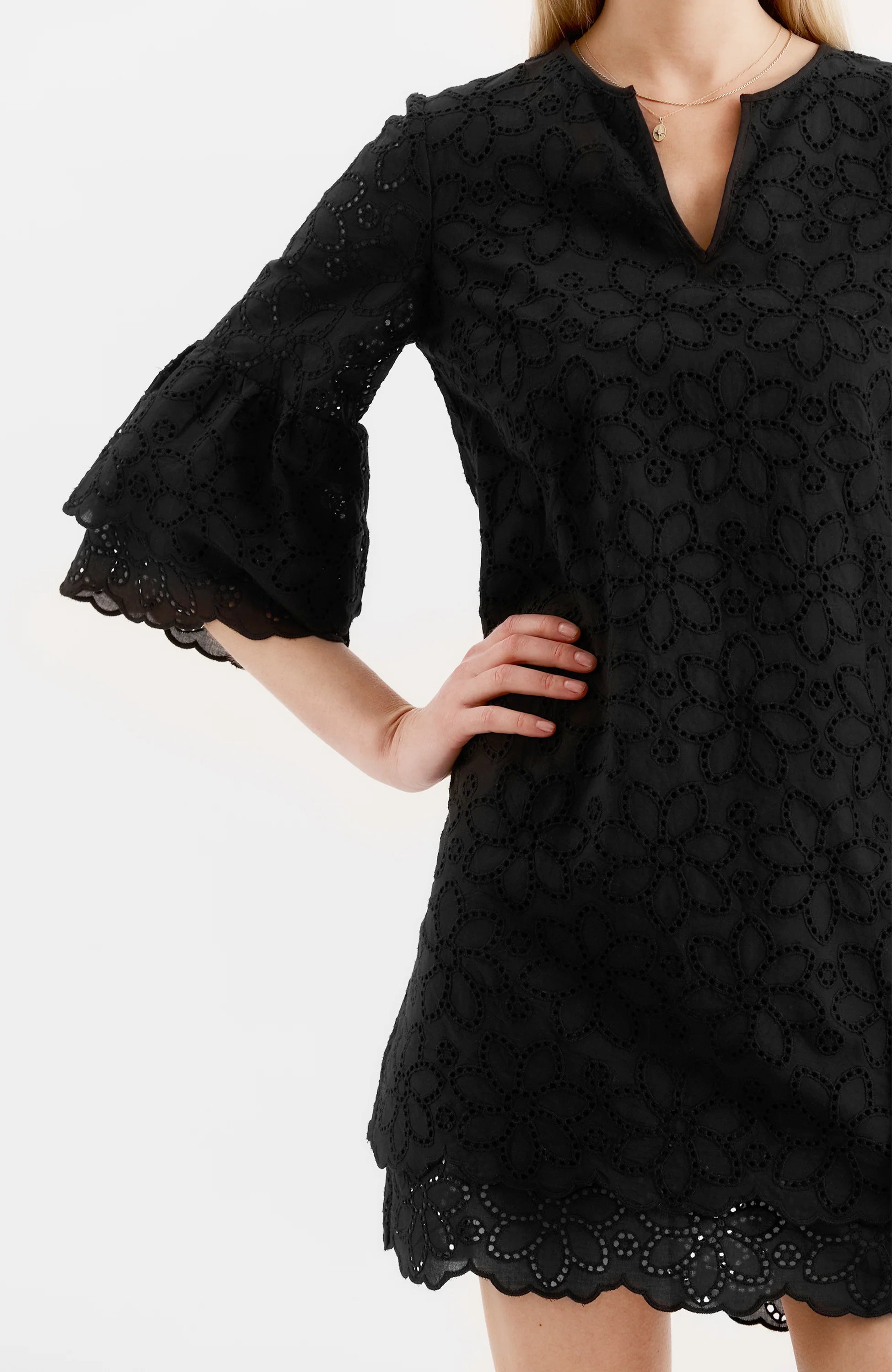 Beautiful and intricate, all over eyelet makes this three-quarter sleeve dress a seasonal favorite. Designed with a double lined scallop hem and bell sleeves for a feminine touch. Style it casually with flat sandals for day, or dress it up with a heel and statement accessories for night!