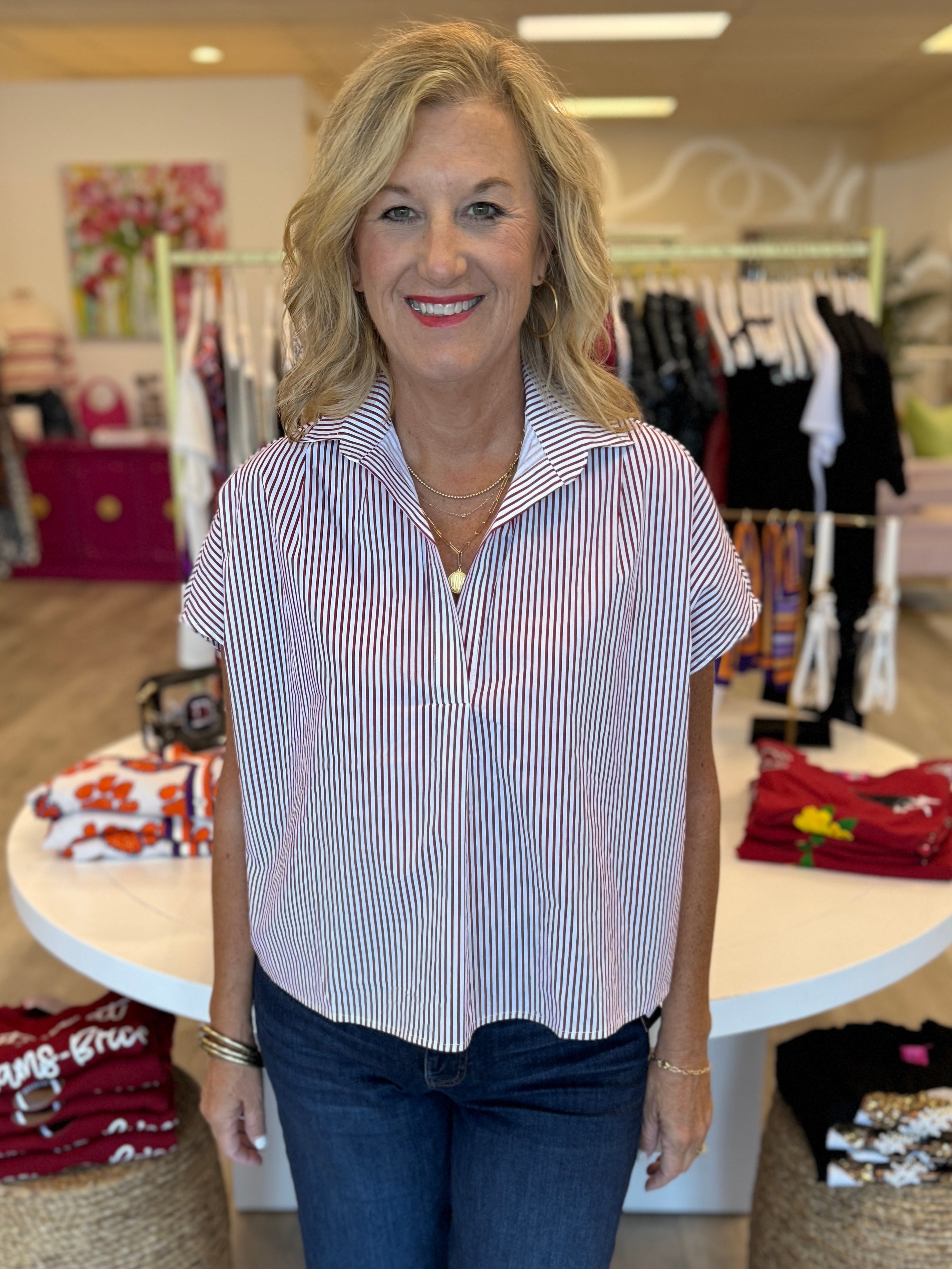 A classic favorite from Karlie is back in a great garnet and white stripe. This would be so cute for Gameday!