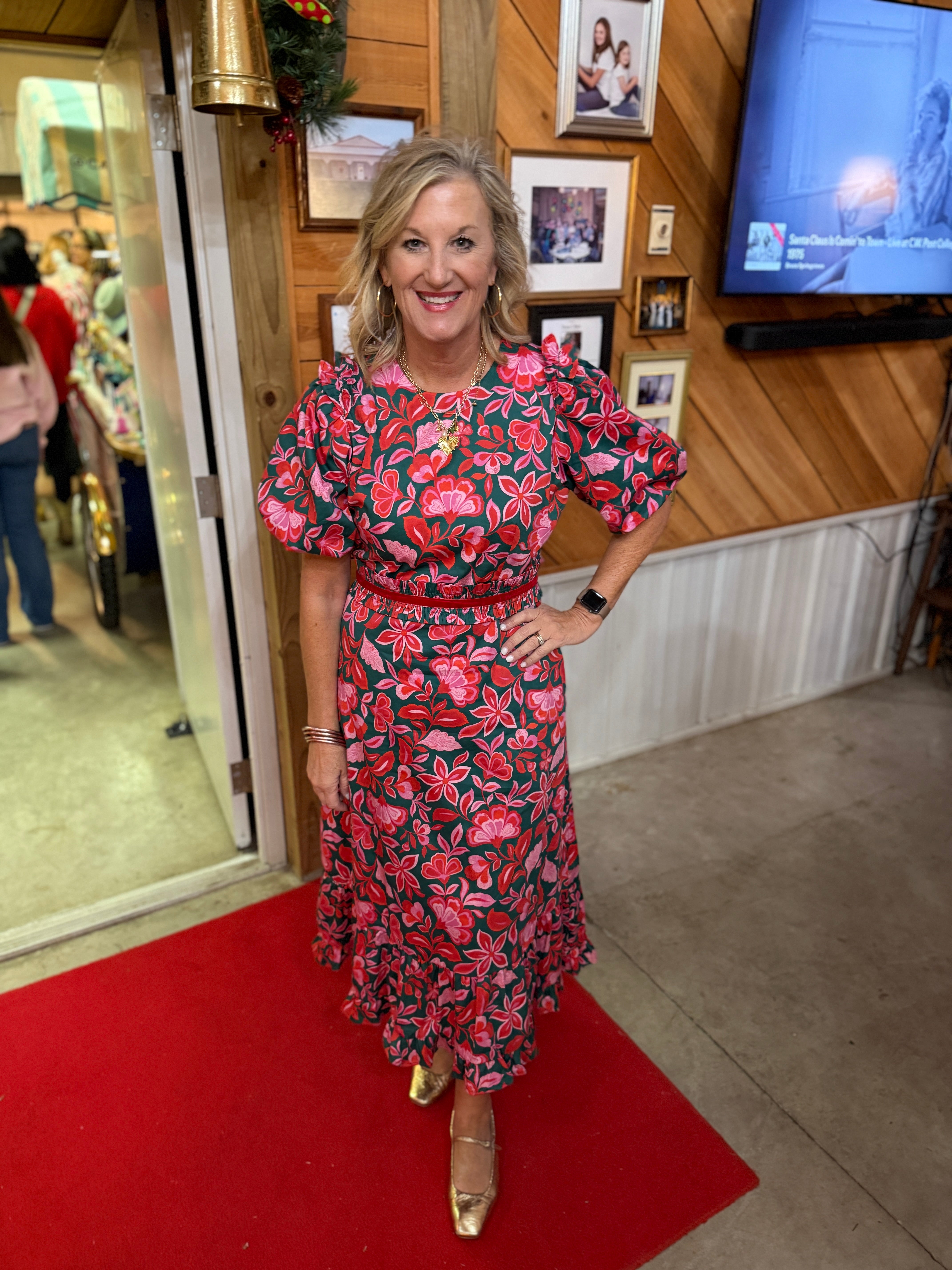 This print is so so happy! We love this for holiday. Cute with or without the belt.