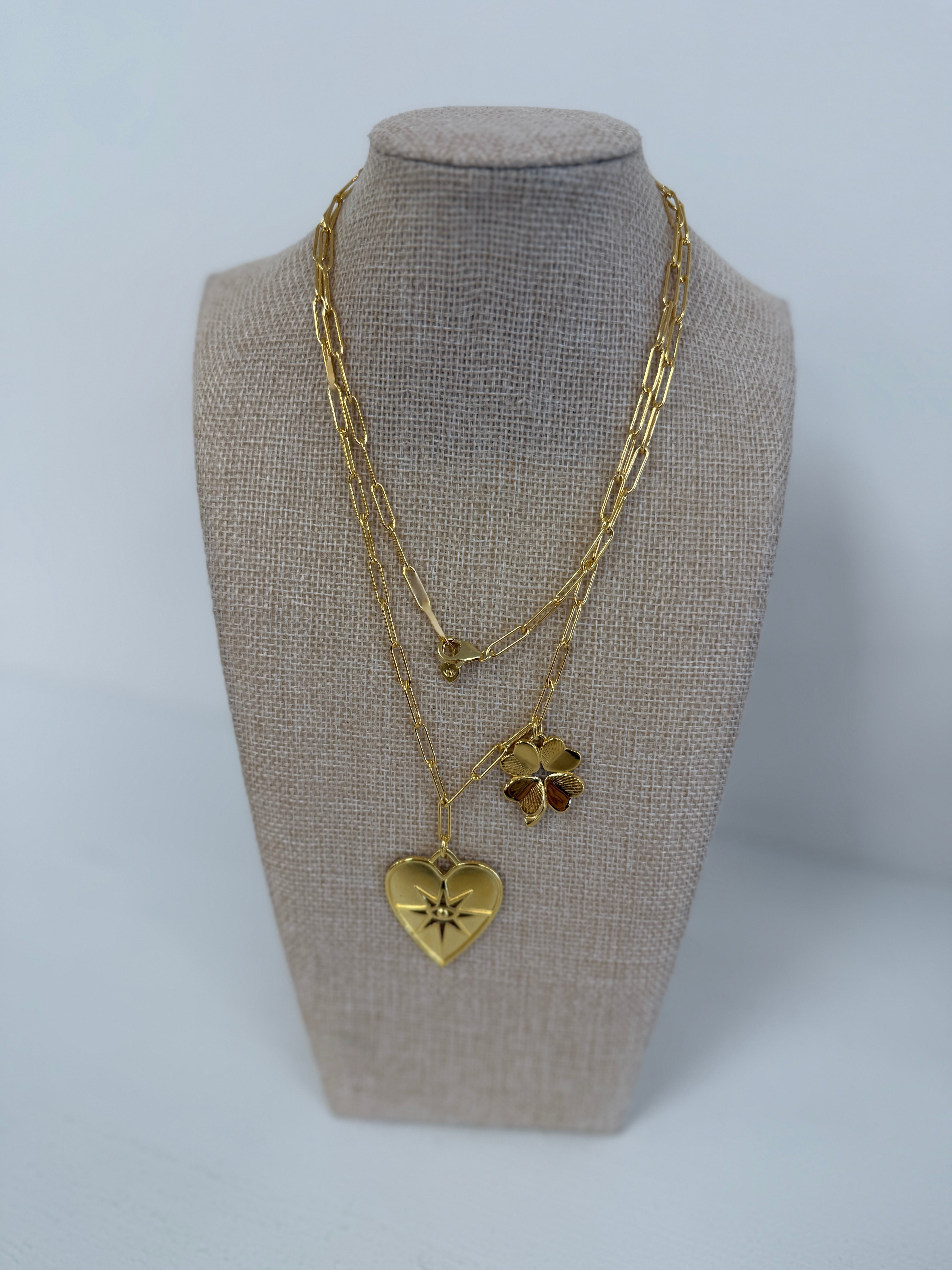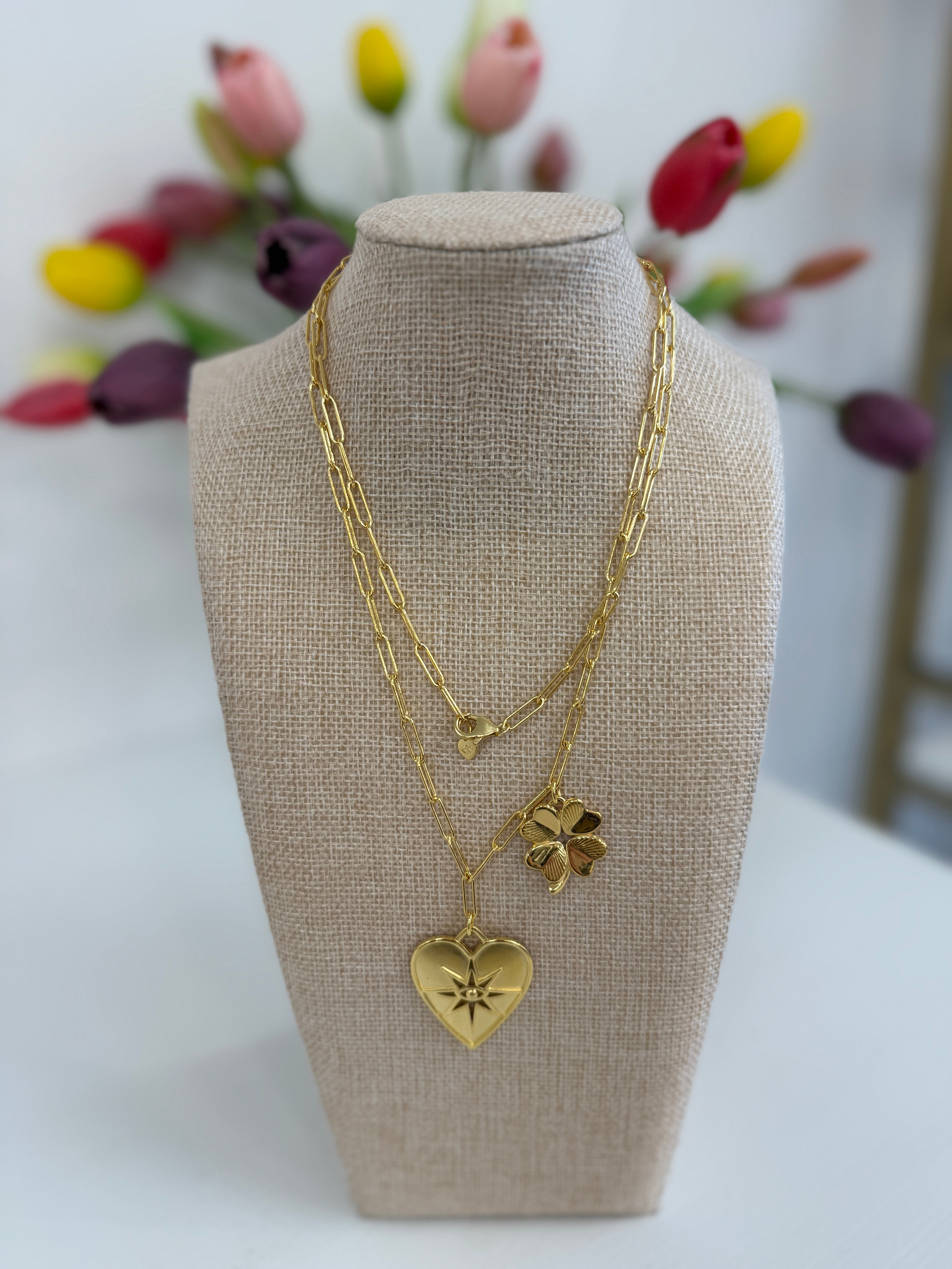 This playful pendant features an eye and starburst at the heart center, symbolizing the power of your intuition. The stones symbolize growth by trusting yourself. Added with our Luck & Love Clover. Long Link 32" with Seeing Heart and Small Luck and Love Clover, 32" is able to be DOUBLE WRAPPED