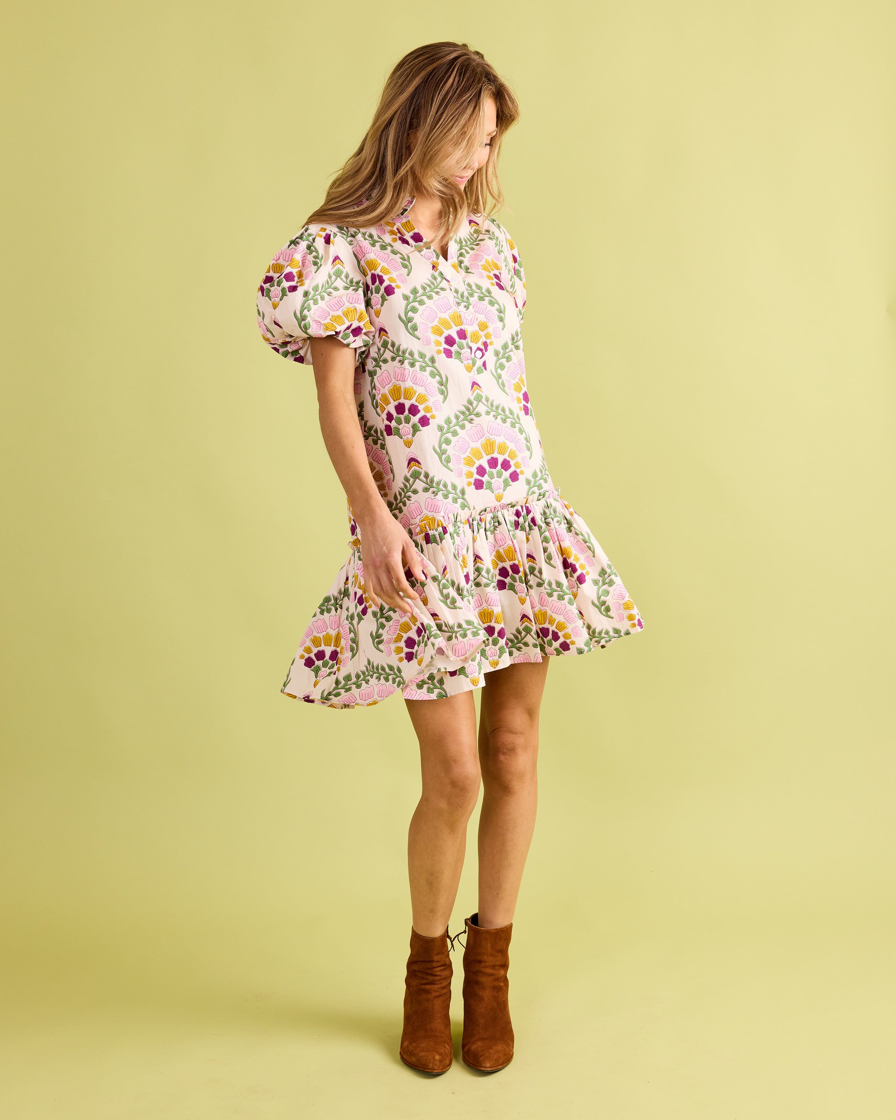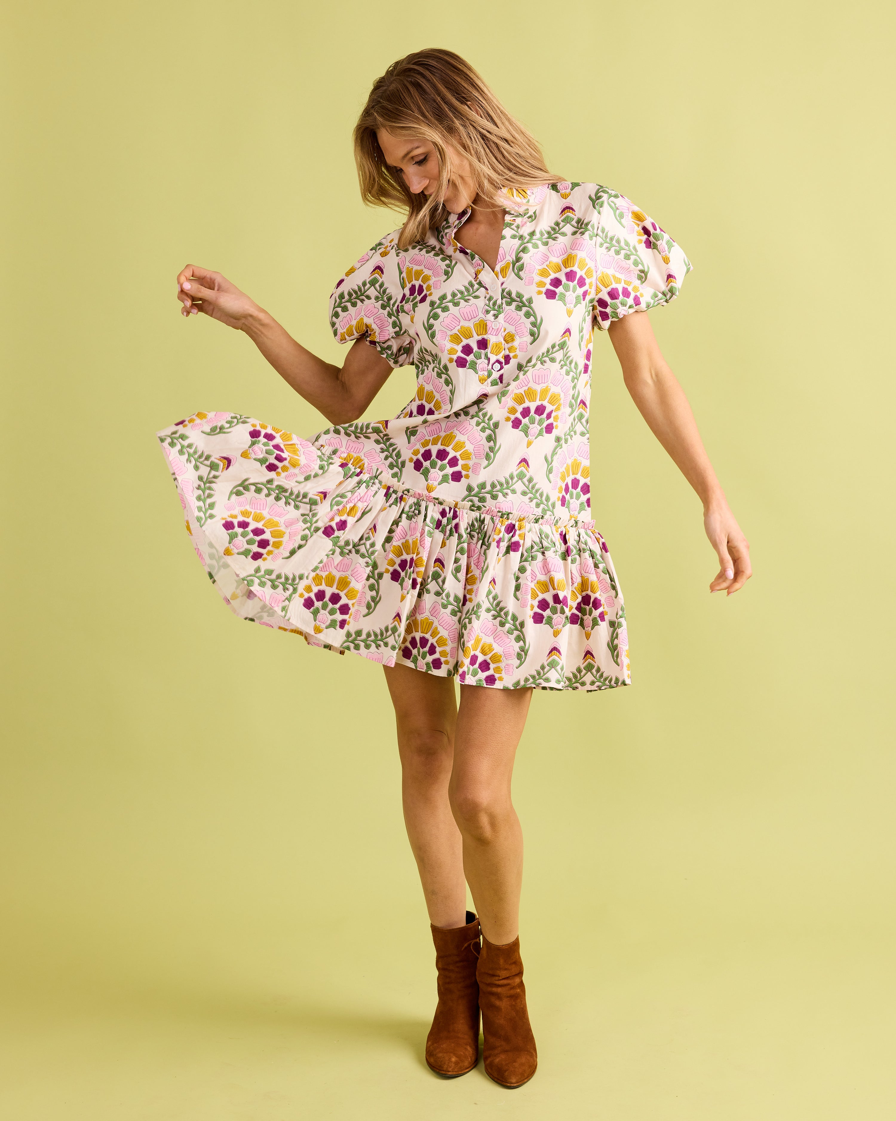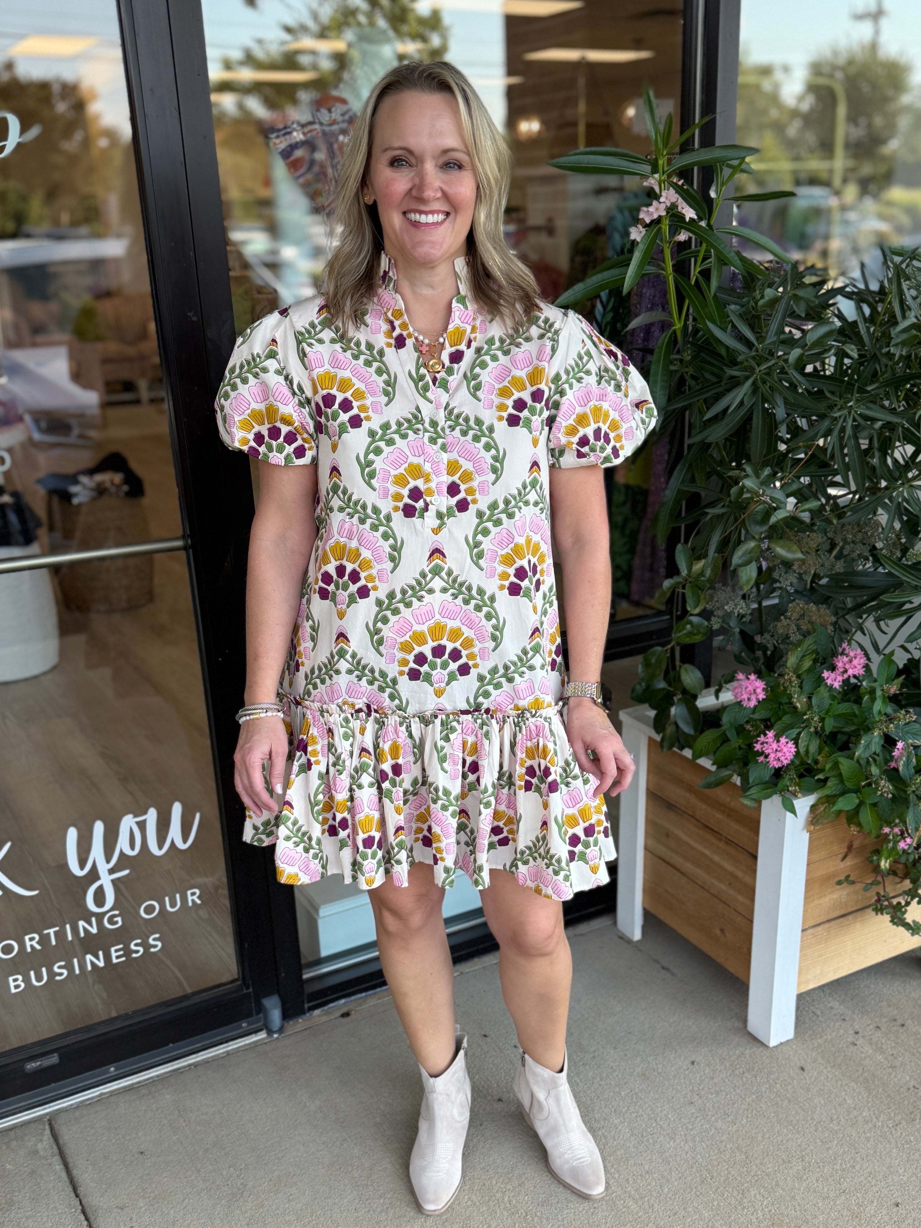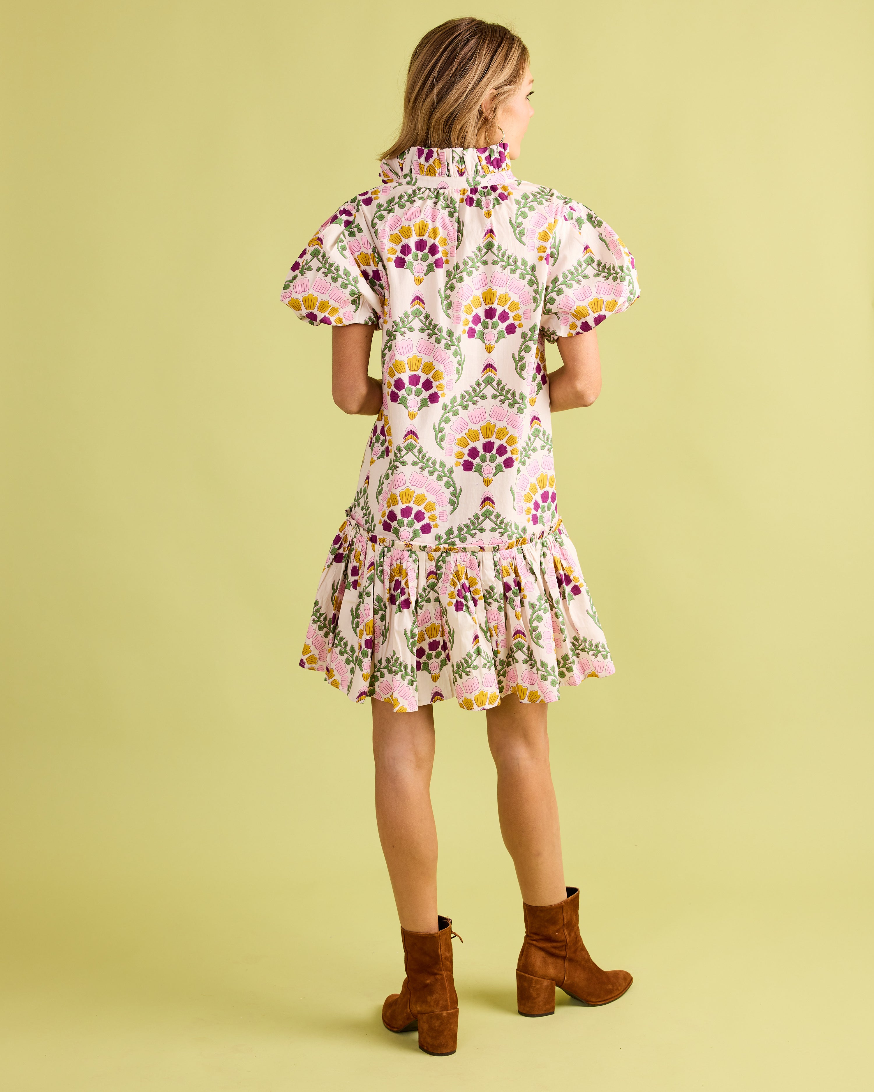 The Gia Dress is a perfect blend of timeless charm and modern style. This short puff sleeve dress features a ruffled mock neck with button-front detailing, and a drop waist ruffled skirt for an additional touch of flare.