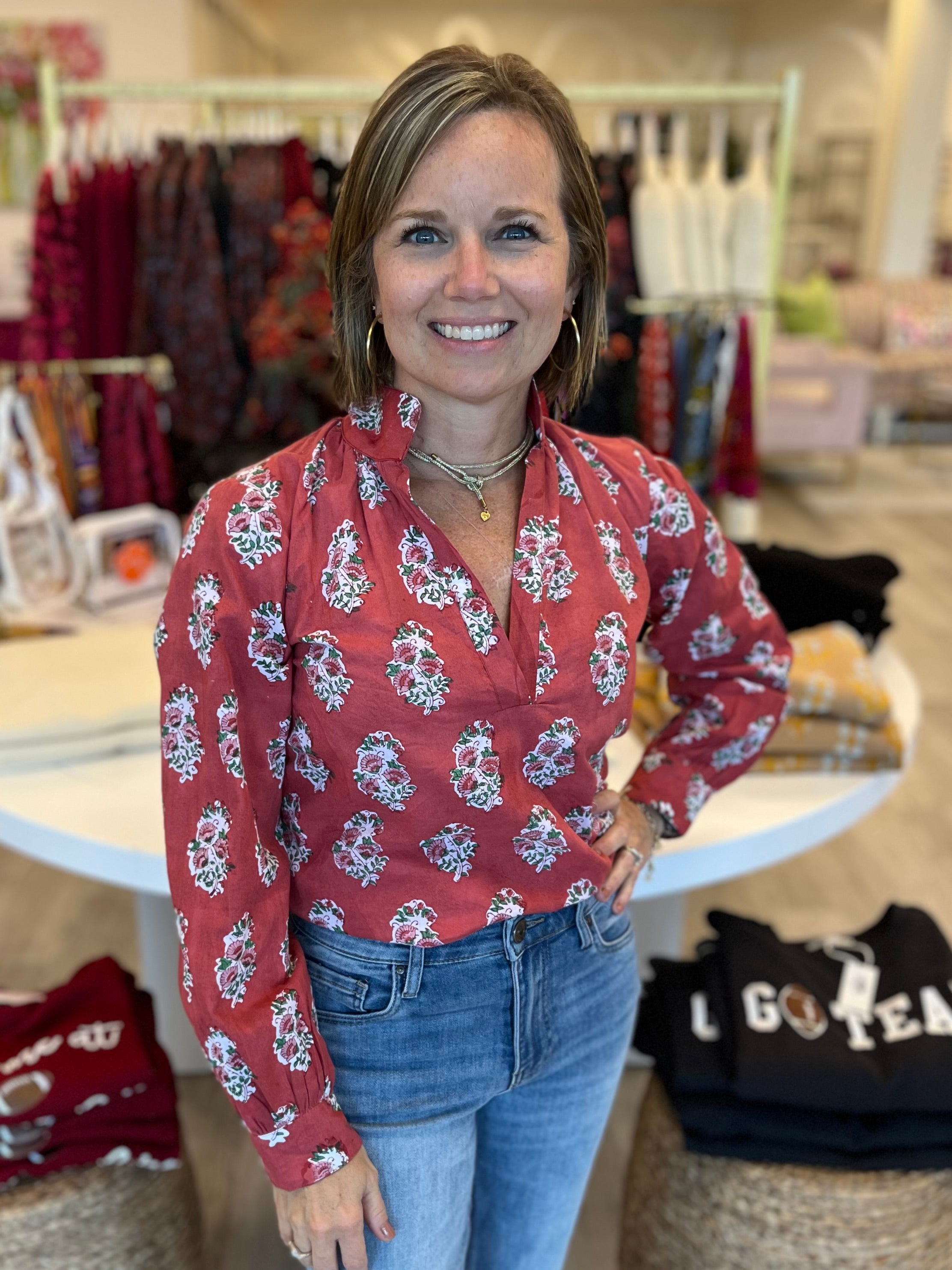 The Gracie Blouse features a standing collar, split neckline, a relaxed fit silhouette, long blouson sleeves with buttoned cuffs, and a slight hi-lo design.