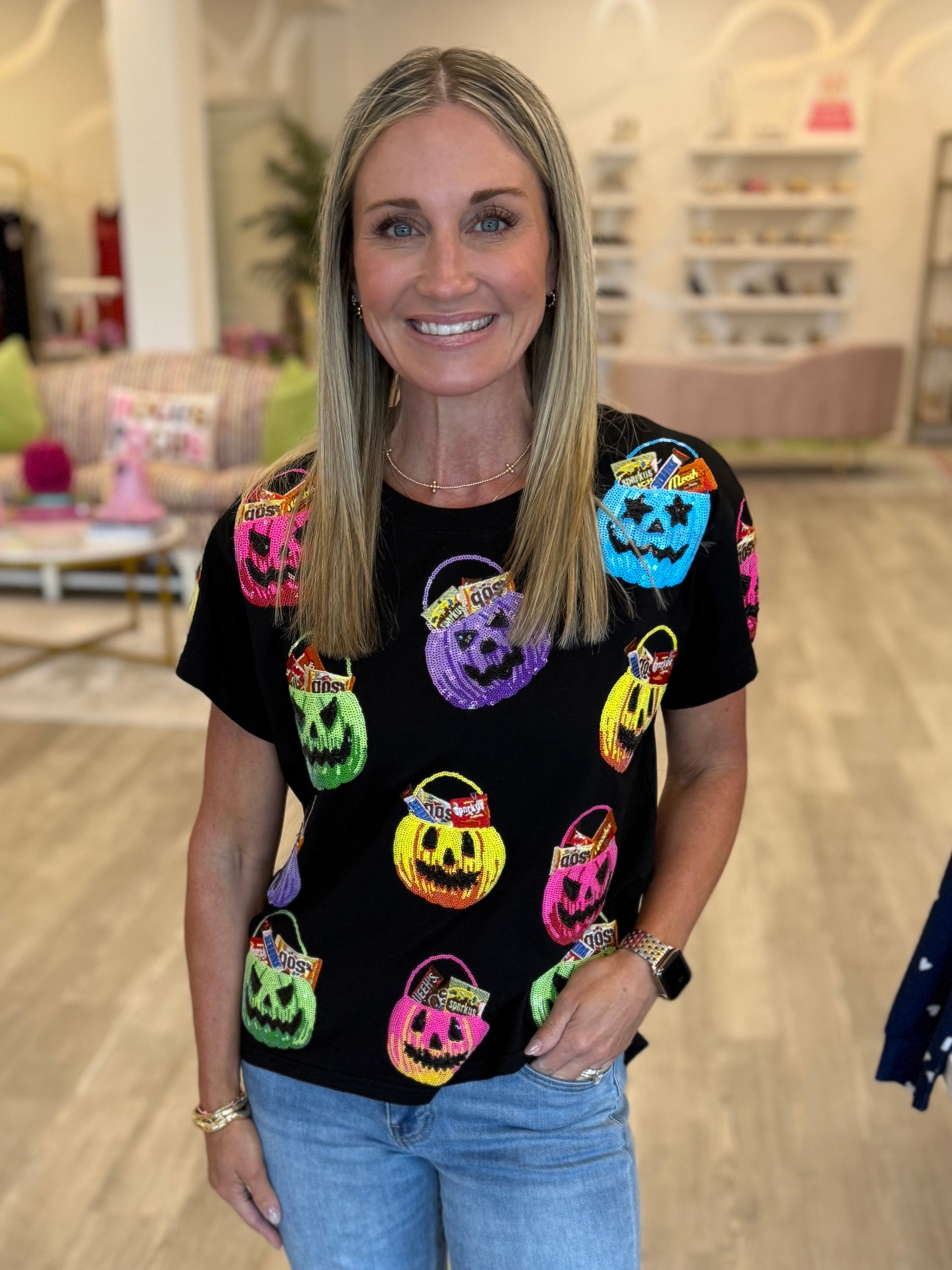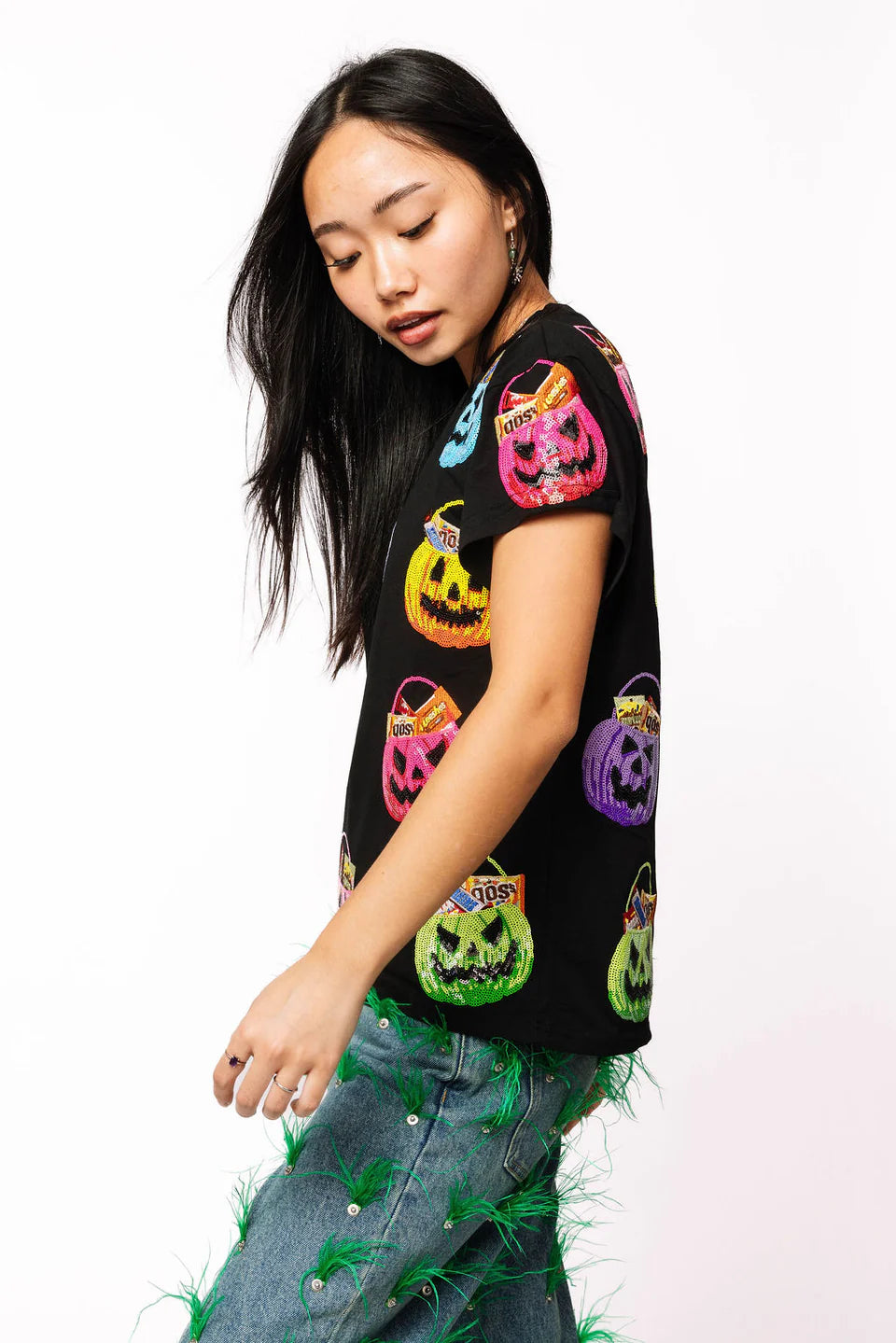 Celebrate spooky season in style with the Black Multi Candy In Halloween Baskets Tee. This playful shirt features a colorful Halloween basket filled with a variety of candies, making it the perfect festive outfit for trick-or-treating or Halloween parties. Comfortable and fun, it adds a sweet touch to your autumn wardrobe.