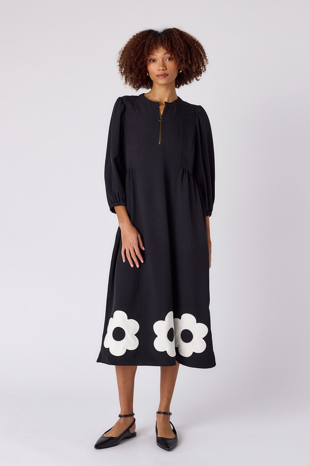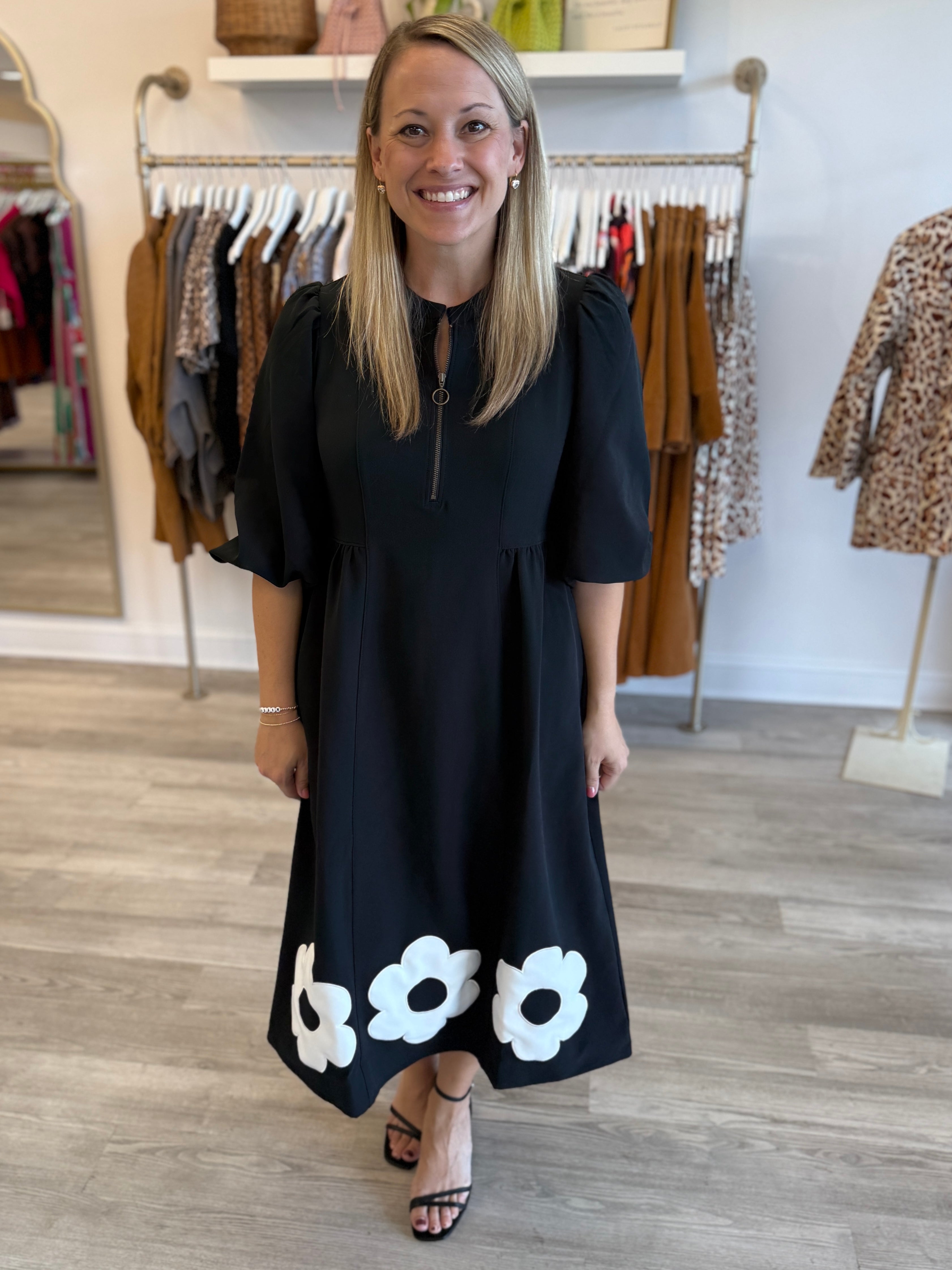 The Indie Dress is back! This midi dress features a front zipper, ¾-length balloon sleeves, and pockets. We adore the bold floral appliqués along the hem, adding the perfect touch of charm.