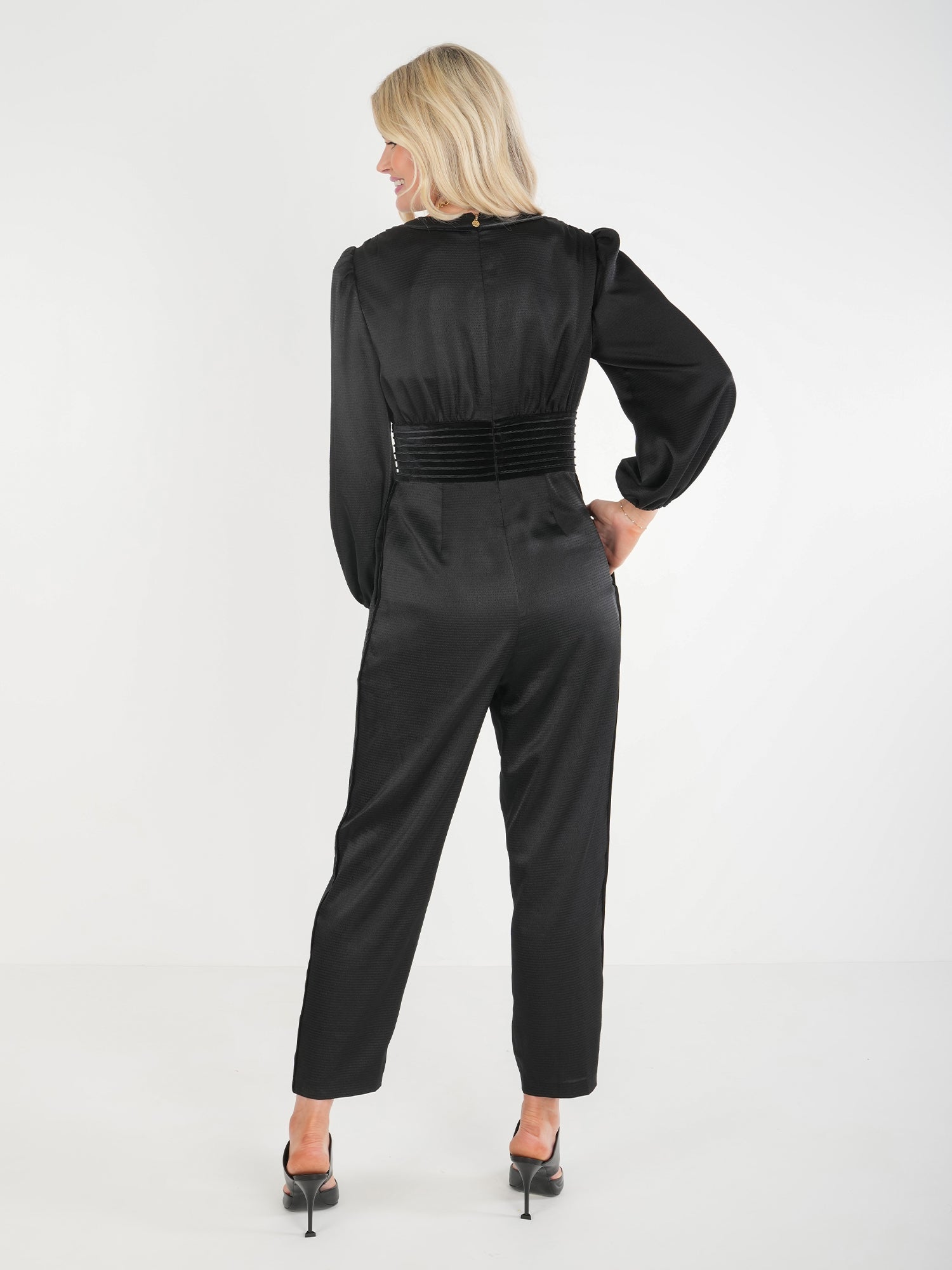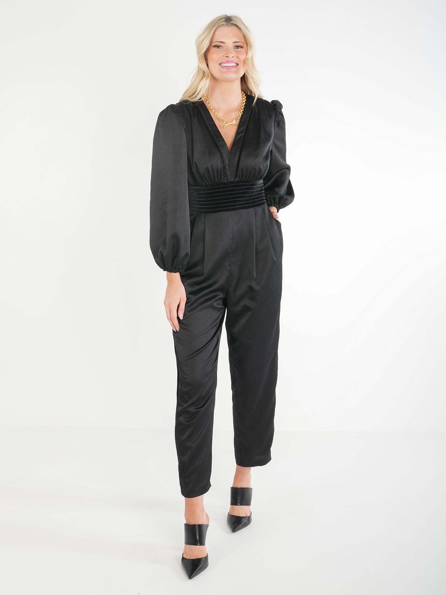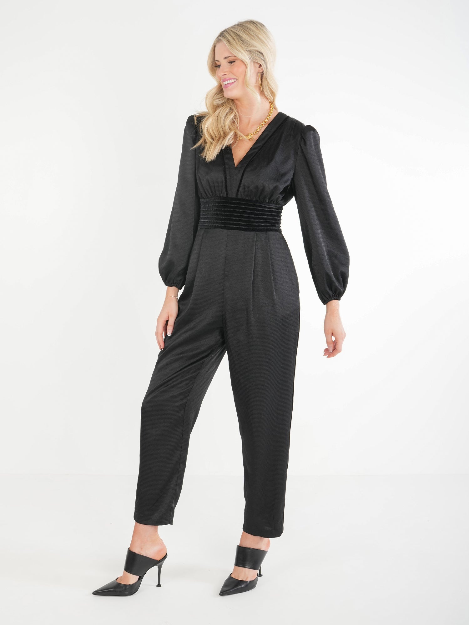 The Isla Jumpsuit in Silent Night is timeless and chic, making it the perfect addition to your capsule wardrobe. This jumpsuit features a thick waistband adorned with luxurious velvet detailing, adding a touch of elevated style. The V-neckline creates a flattering frame for statement jewels, while the hidden back zipper closure ensures a comfortable and secure fit. Isla's sleek design and high-quality fabric make it a versatile and stylish choice for any occasion.