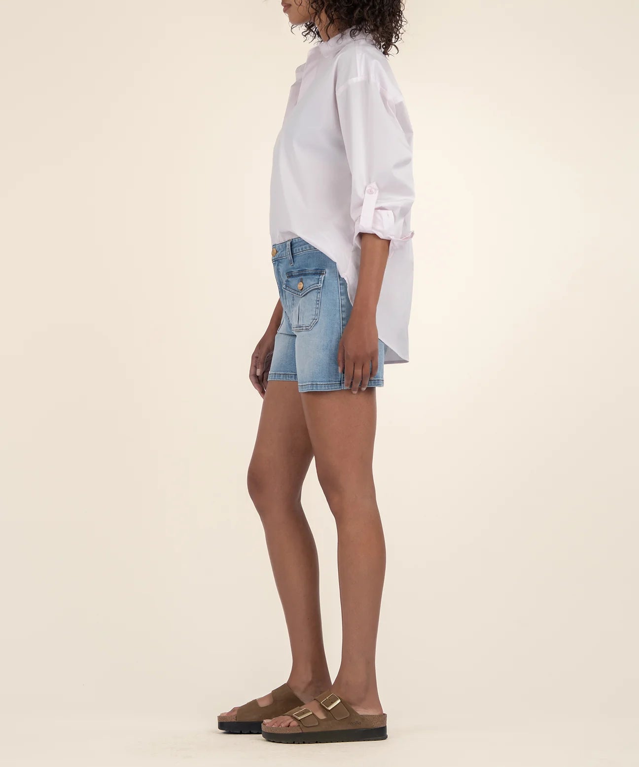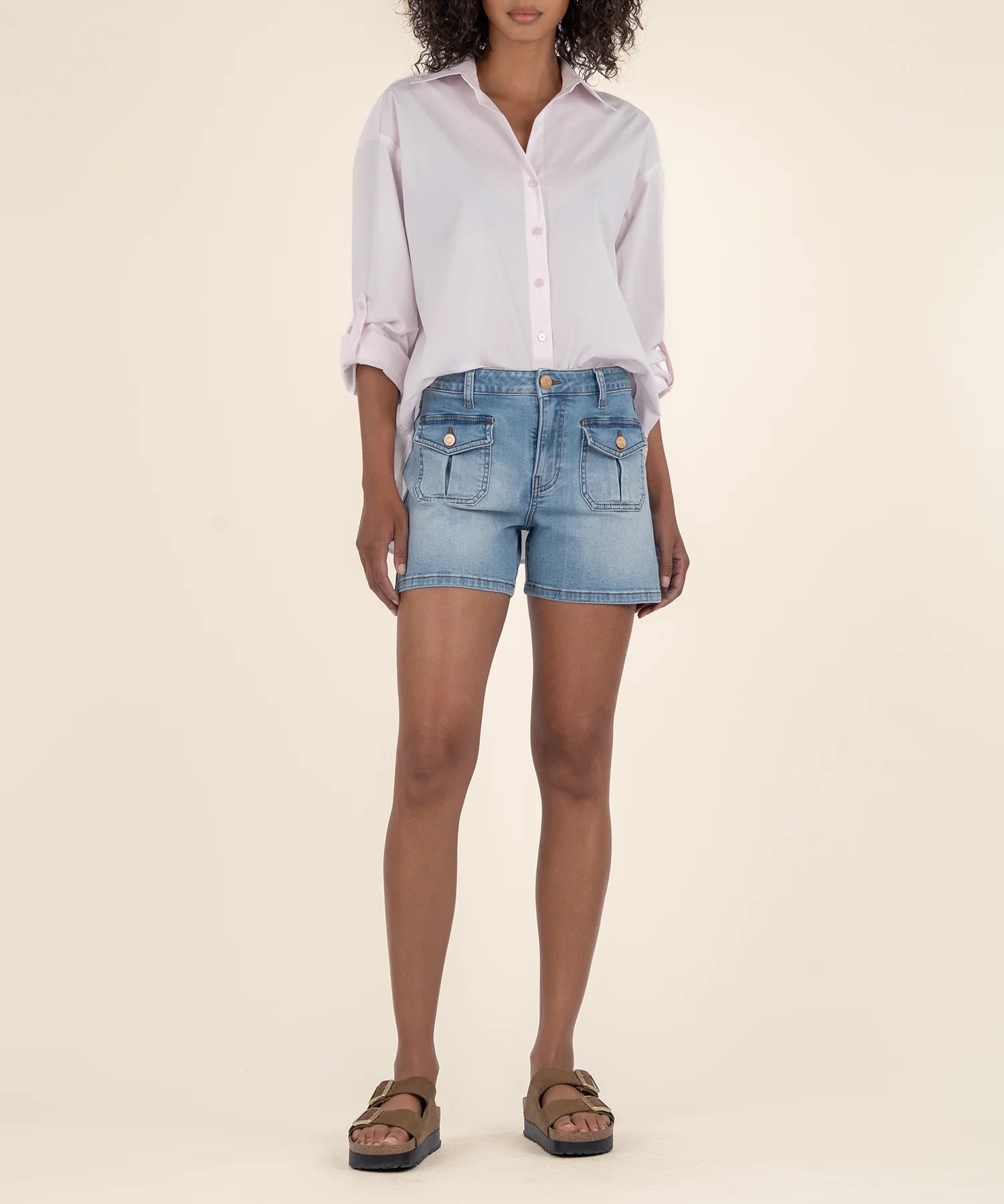 - Elevate your style with these high-rise shorts, featuring eye-catching front pleat flap pockets that add a unique, structured touch. Designed for a flattering fit, they effortlessly combine sophistication and functionality.