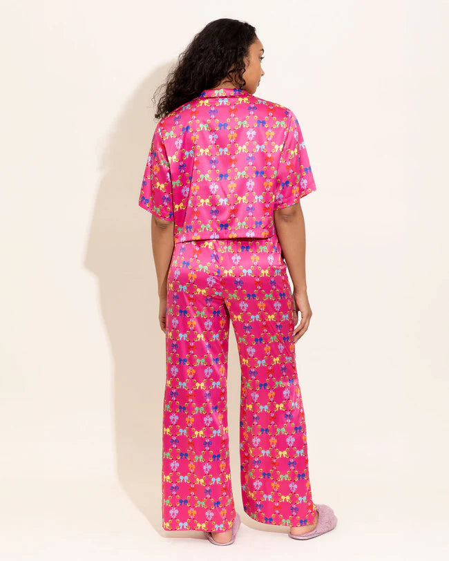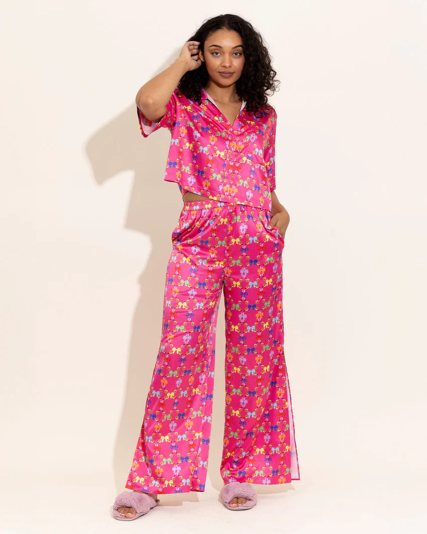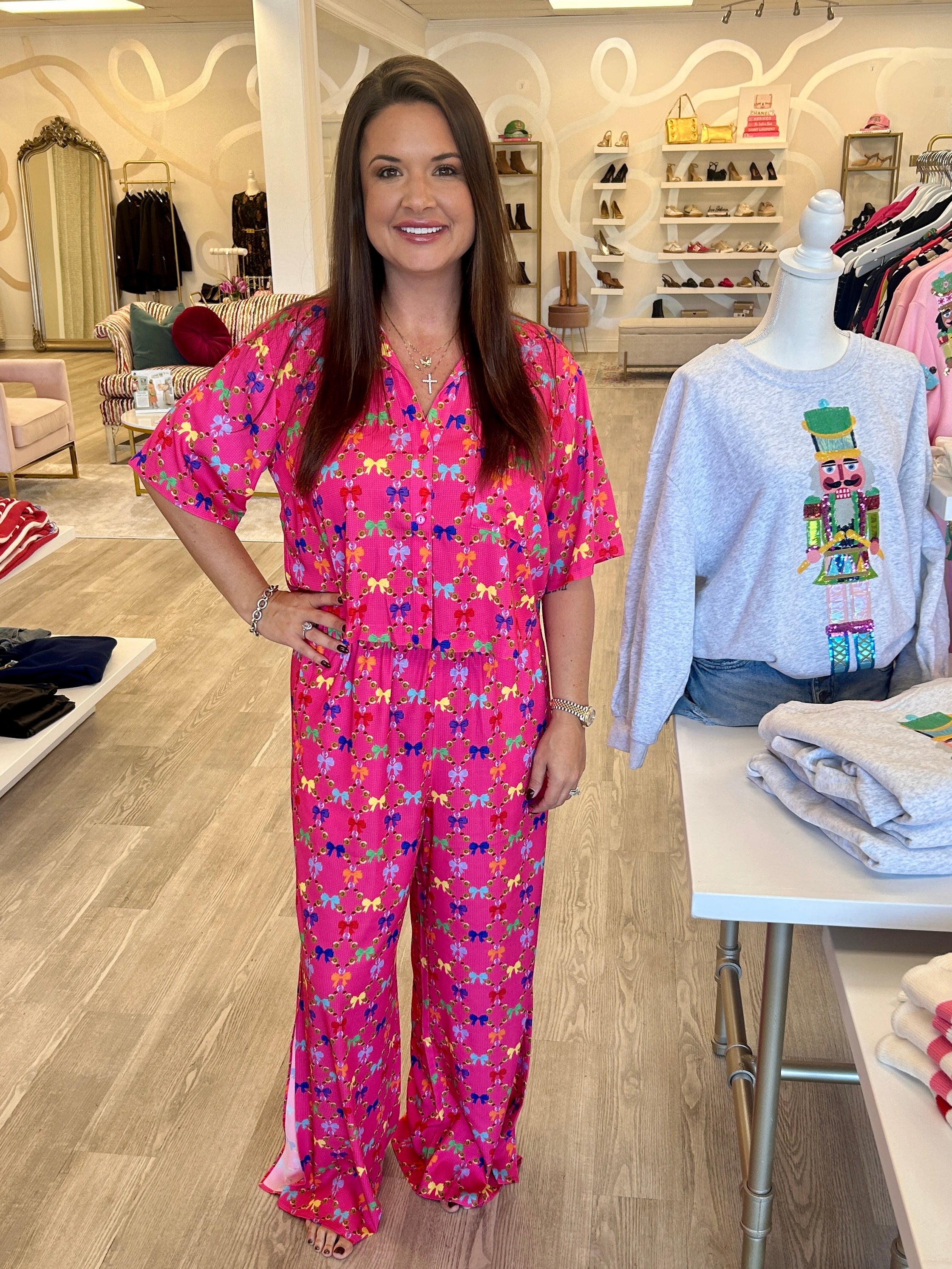 Step up your PJ game in our Jolly Pajama Set! Perfect for the holiday season in our Bowtastic print featuring flared pants with functional pockets and a button down top.