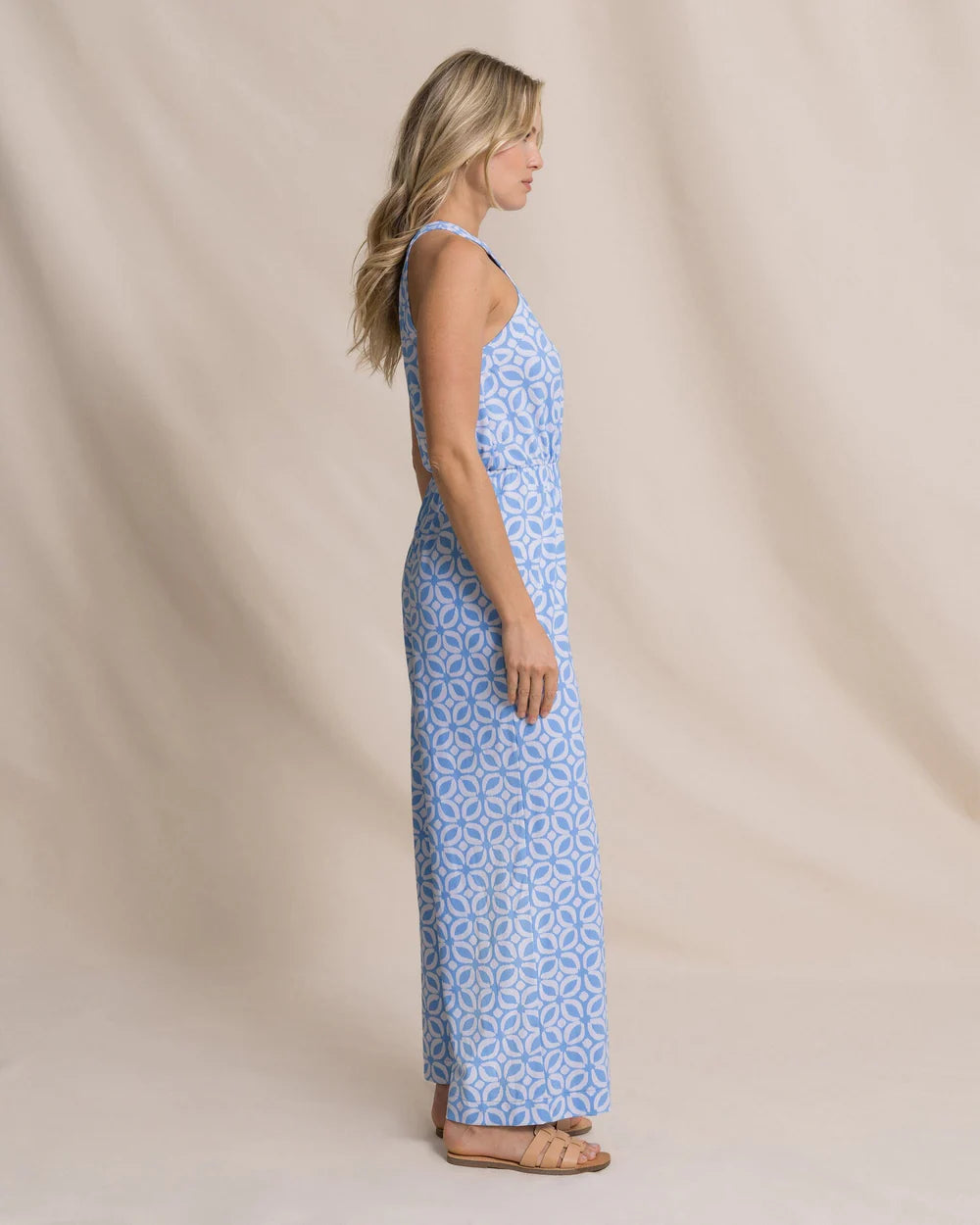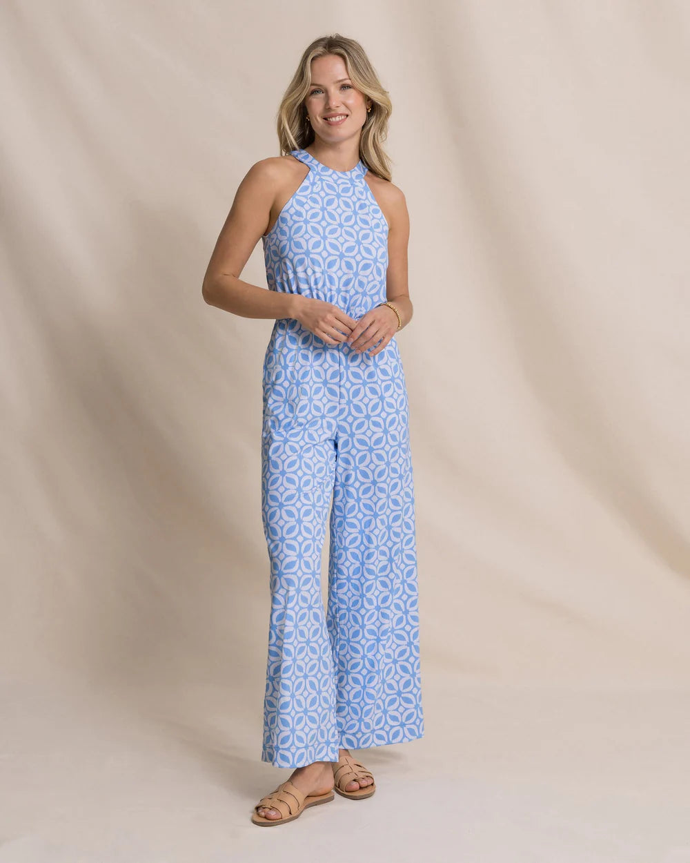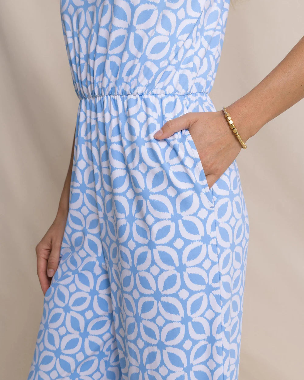 Bold style and easy movement come together in the Karrigan Printed Performance Jumpsuit. Crafted from stretch performance fabric with wicking and cooling properties, it’s lightweight, flattering, and made for all-day wear—transitioning effortlessly from daytime plans to relaxed weekends with coastal flair.