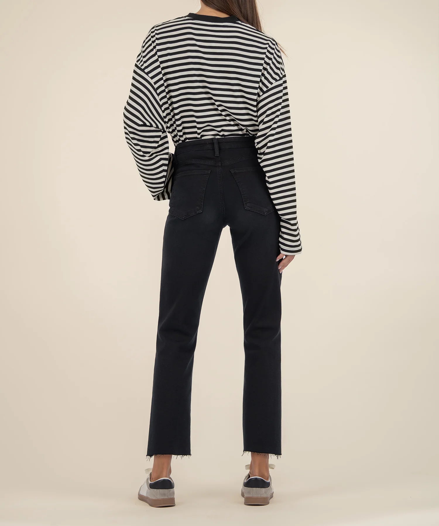 - These high-rise jeans with a raw edge hem and ankle kick flare offer a flattering, sculpted fit and fashion-forward look.