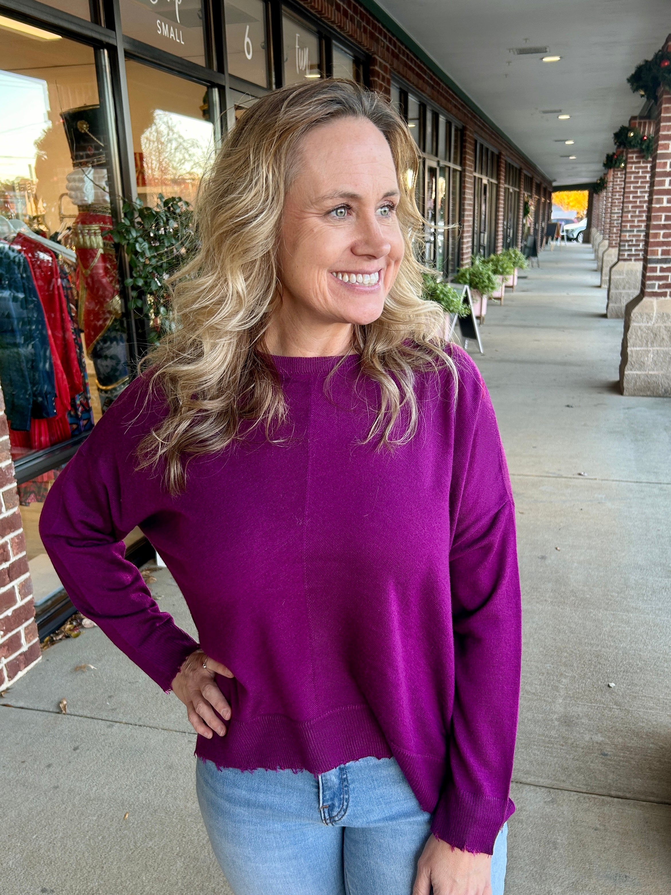 Oversized long-sleeve Crew neck top with Center seam and Ripped hem detail.