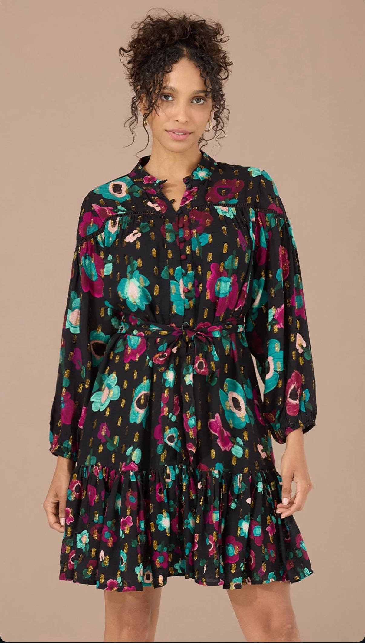 The perfect mini dress for your Holiday soirees! This painted floral print frock features voluminous blouson sleeves, embroidered yoke detail, and an optional waist tie, and the perfect amount of sparkle. Comes with a detachable slip underneath.