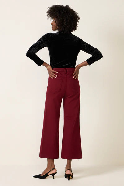 Make a bold statement in these high-rise wide leg jeans, designed in a rich maroon color with a chic raw hem. Featuring our flattering Fab Ab pockets and crafted from super stretchy material, they smooth, sculpt, and move with you—for style that feels as good as it looks.