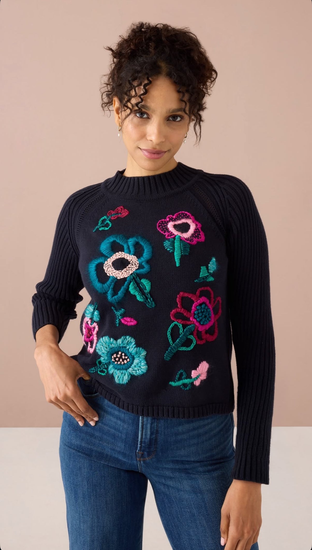 Made from the softest organic cotton, this sweater is the perfect weight for Fall. Featuring a mock neckline, ribbed sleeves, and hand embroidered flowers by artisans in India.
