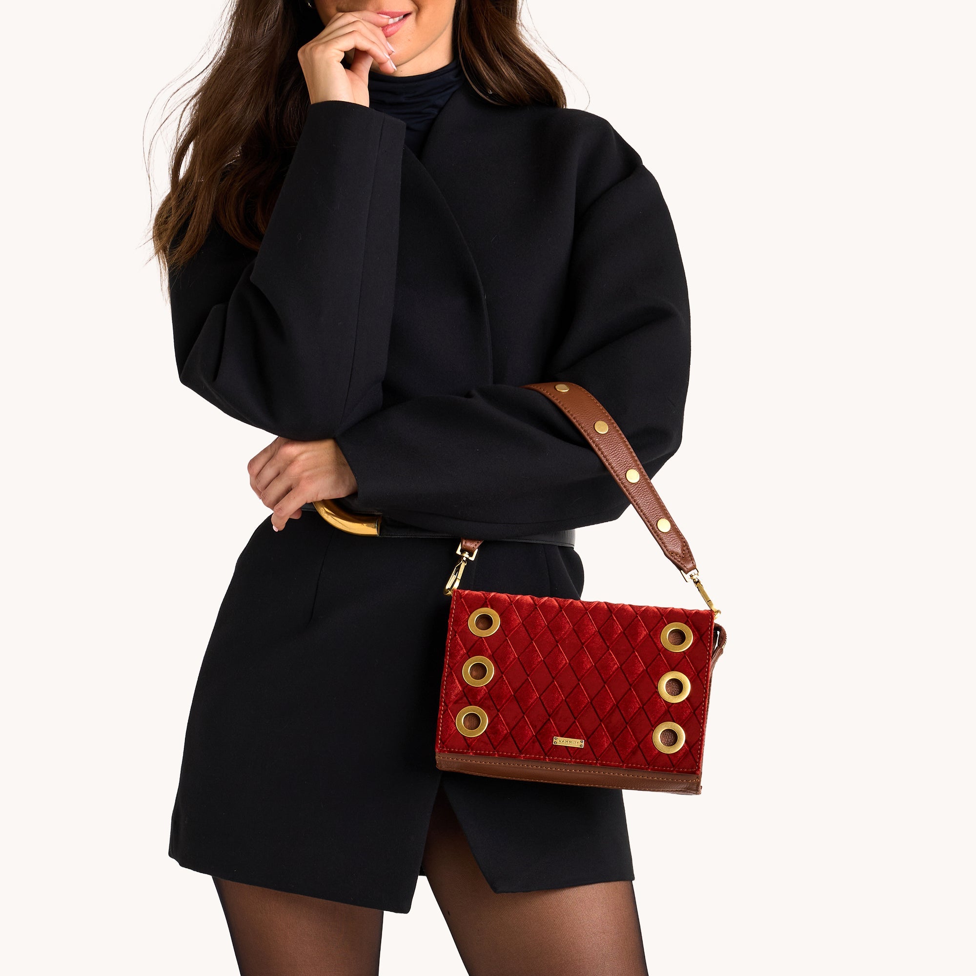 - Crafted with a deep, saturated, toasted, orange-patterned Italian velvet with hints of russet, umber, and sienna, and deep brown pebble leather accents
