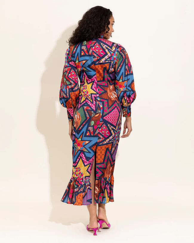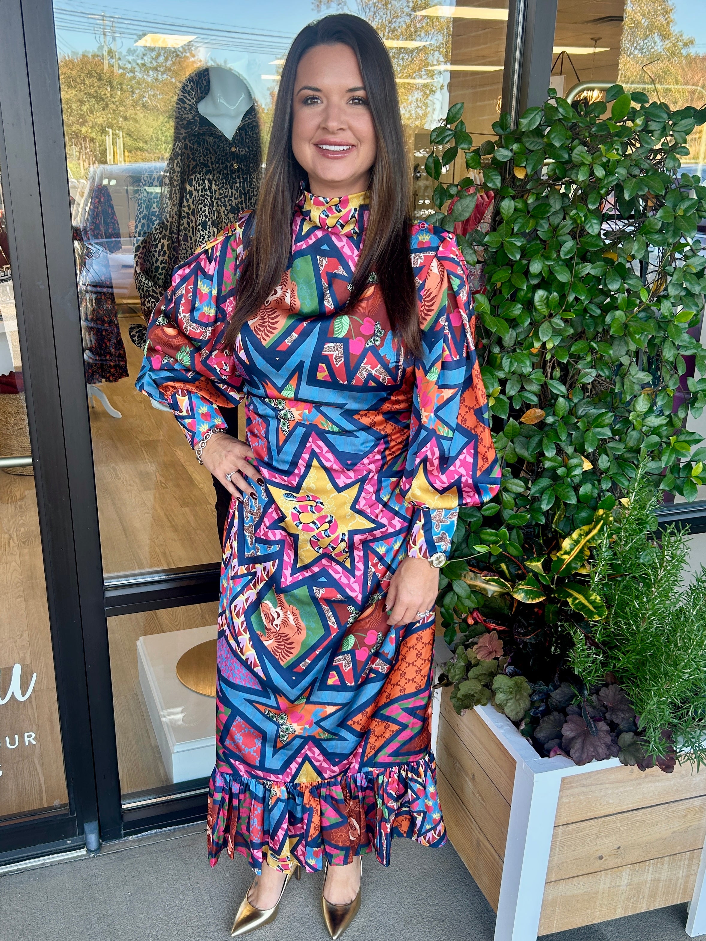 Classy and chic, The Parker Dress is making a statement with a mock neckline, balloon sleeves and a maxi skirt with ruffle trim.