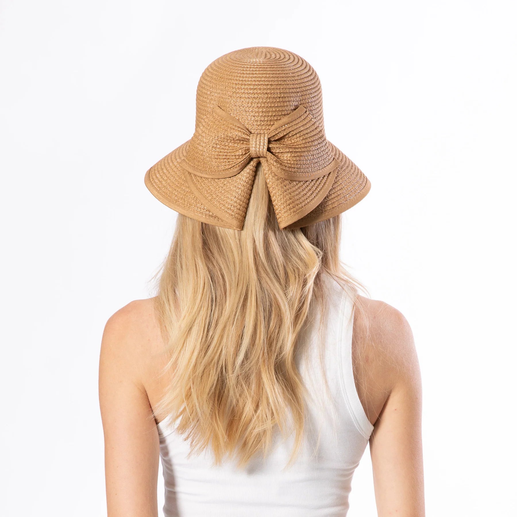 Crafted from paper braid with refined tonal grosgrain trim, this bucket hat features a practical back vent and an elegant self-tie bow. A versatile style that balances structured construction with understated sophistication.