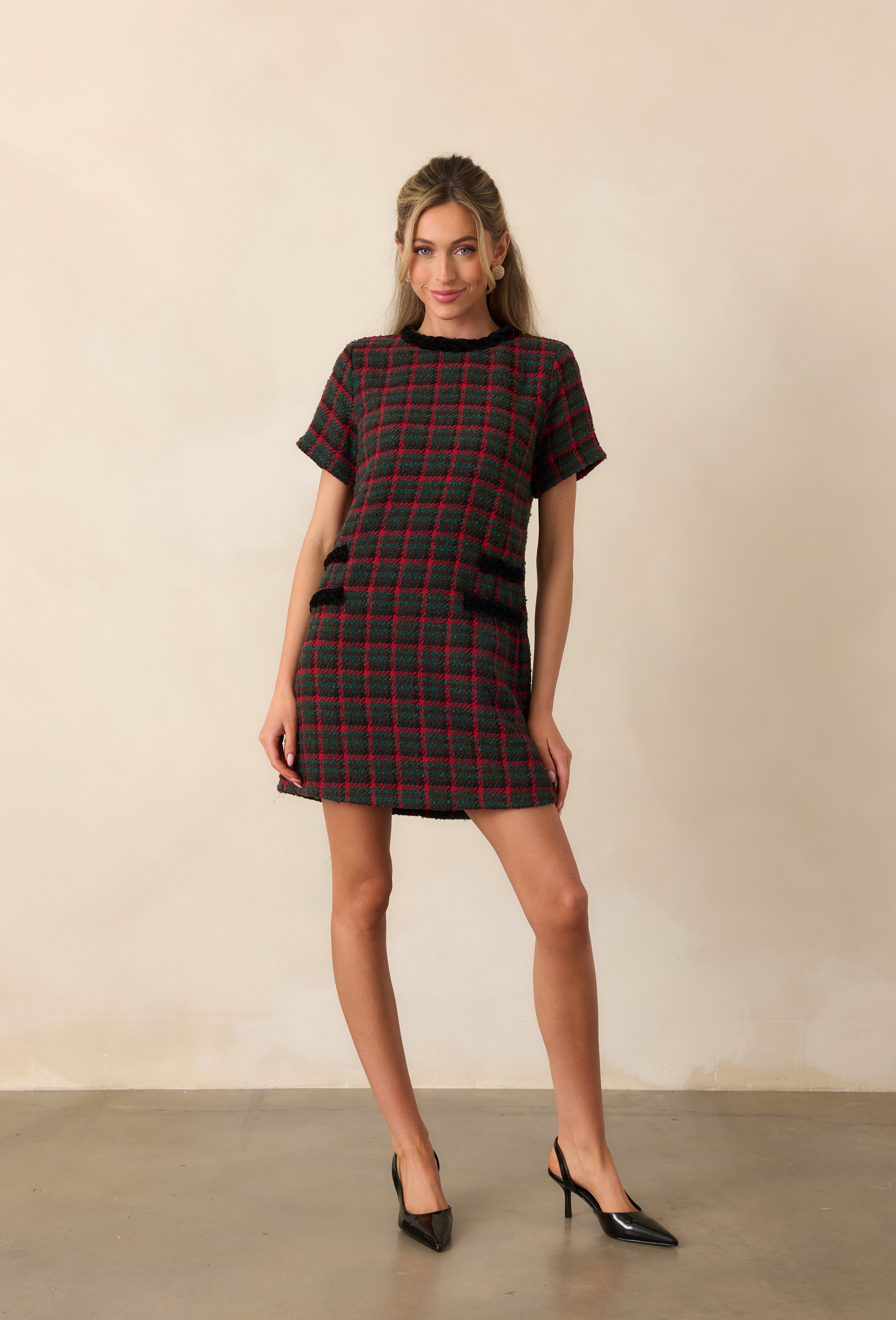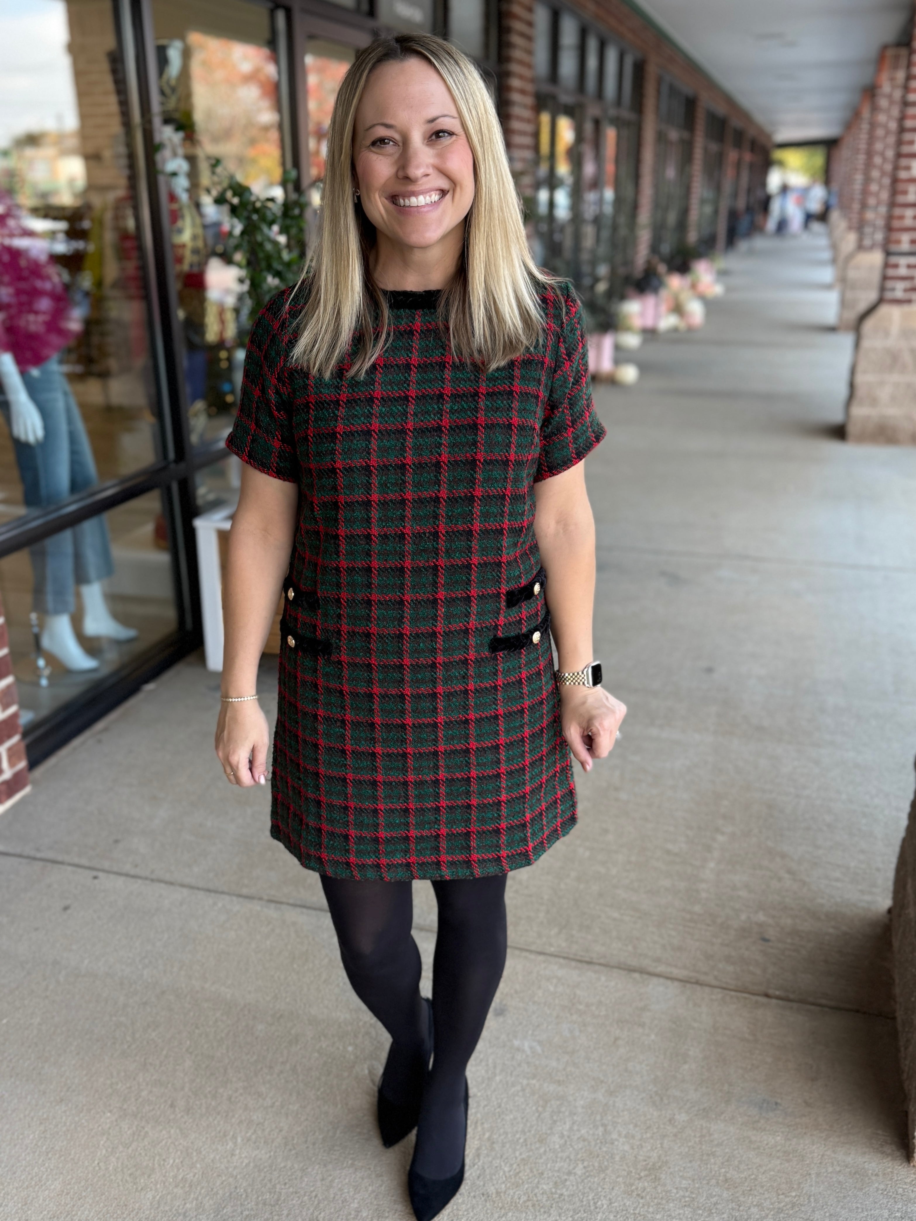 The sweetest tweed dress in a traditional holiday plaid. Love the little details.