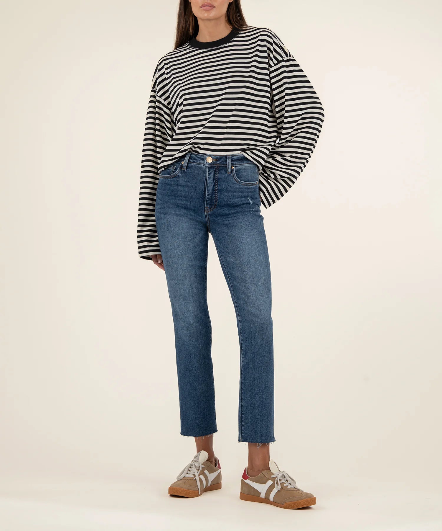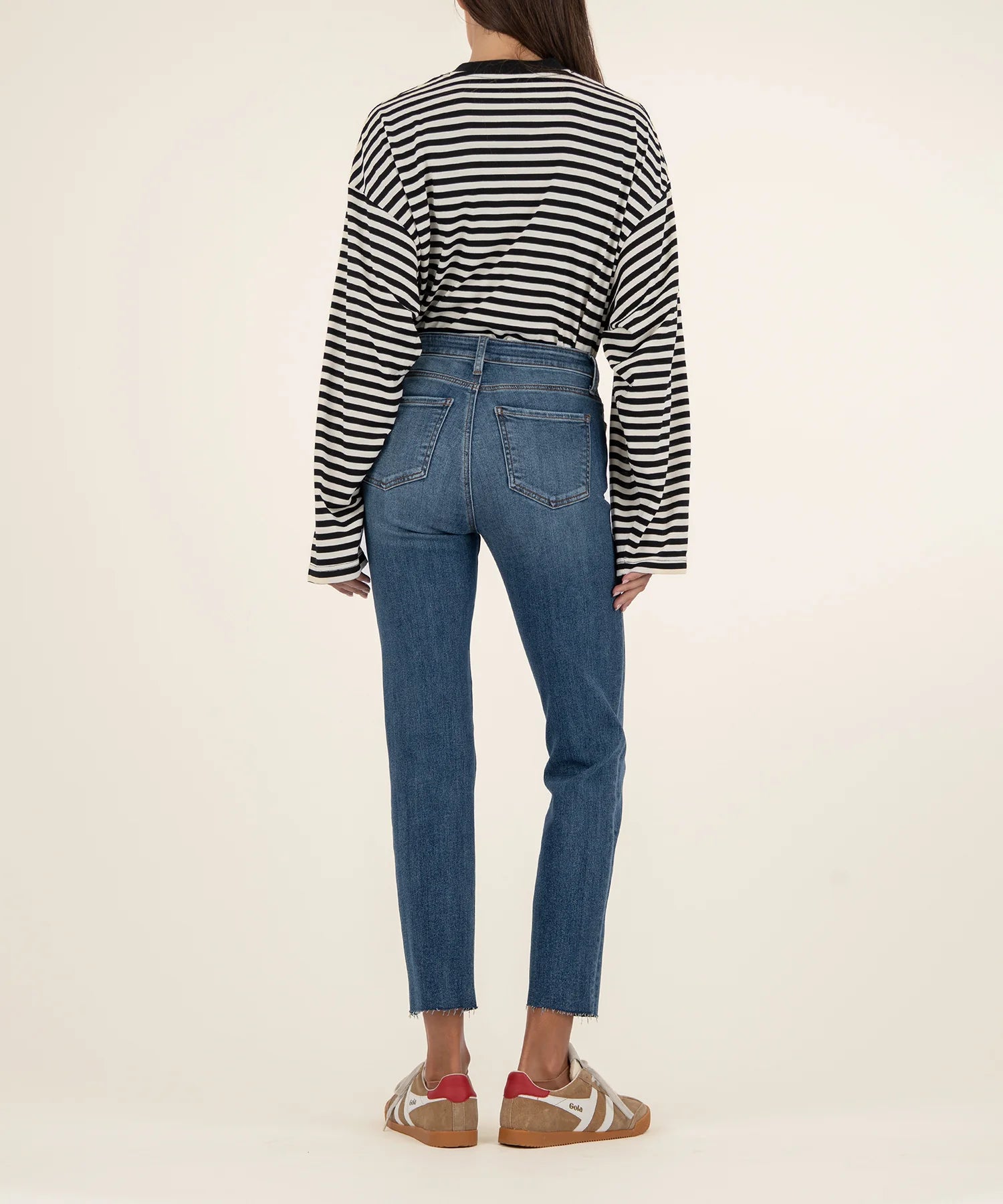 - Step into effortless cool with these high-rise ankle straight jeans in a versatile medium wash. Featuring Fab Ab for a flattering fit, a trendy raw hem, and a touch of distressing, they’re made from stretchy material for comfortable all-day wear. Perfect for casual looks with an edge.