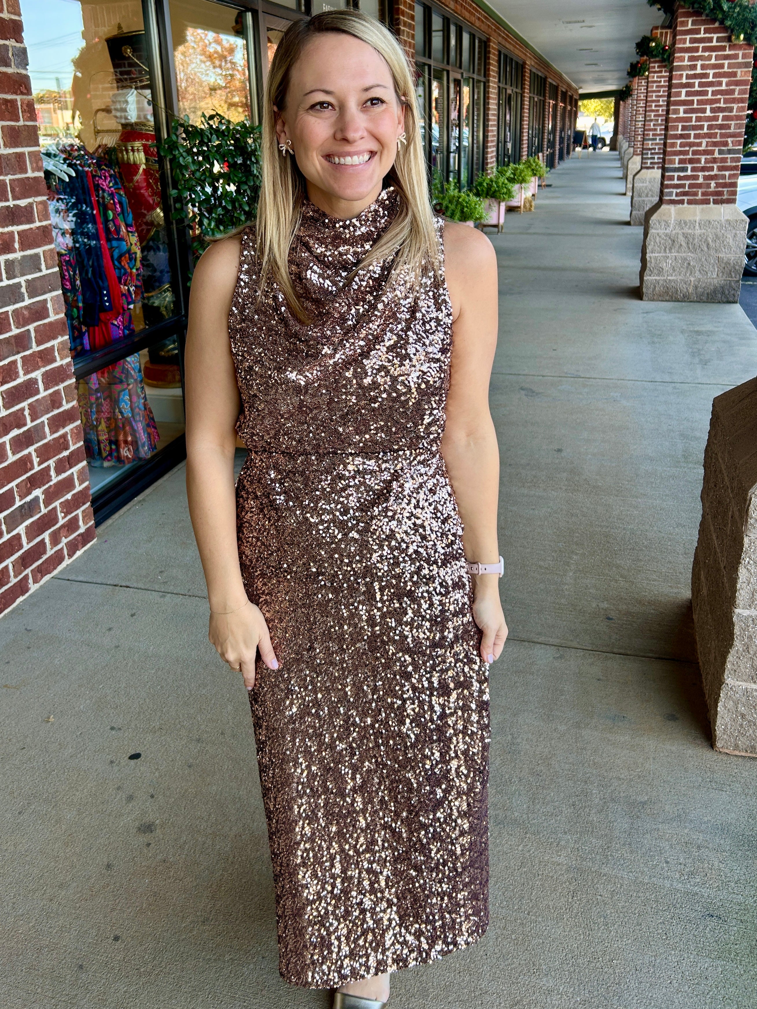 The Rhodes Skirt in Bronze offers a head-to-toe sequin moment when paired with the Bree Tank or would be super cute with a sweater.