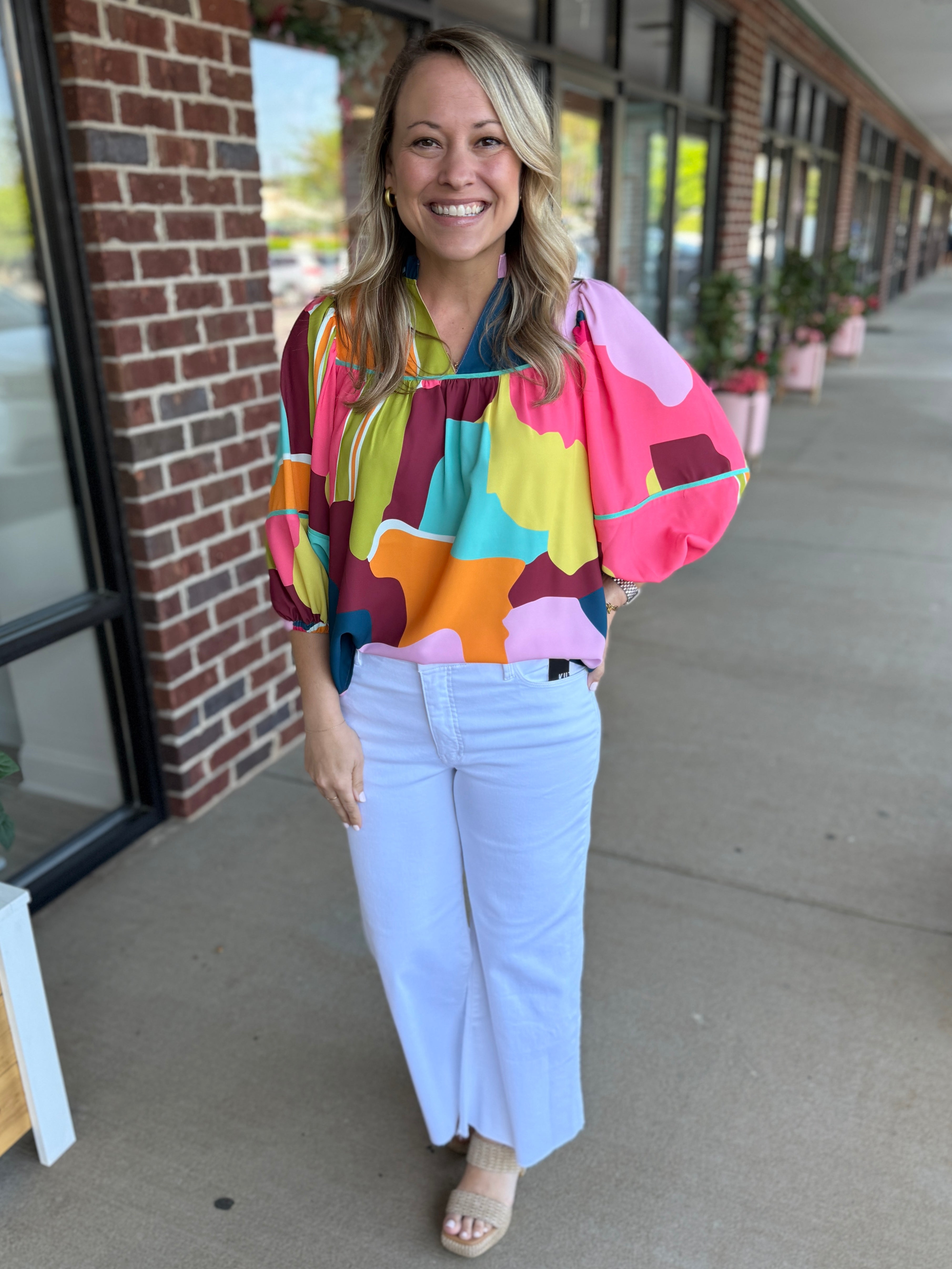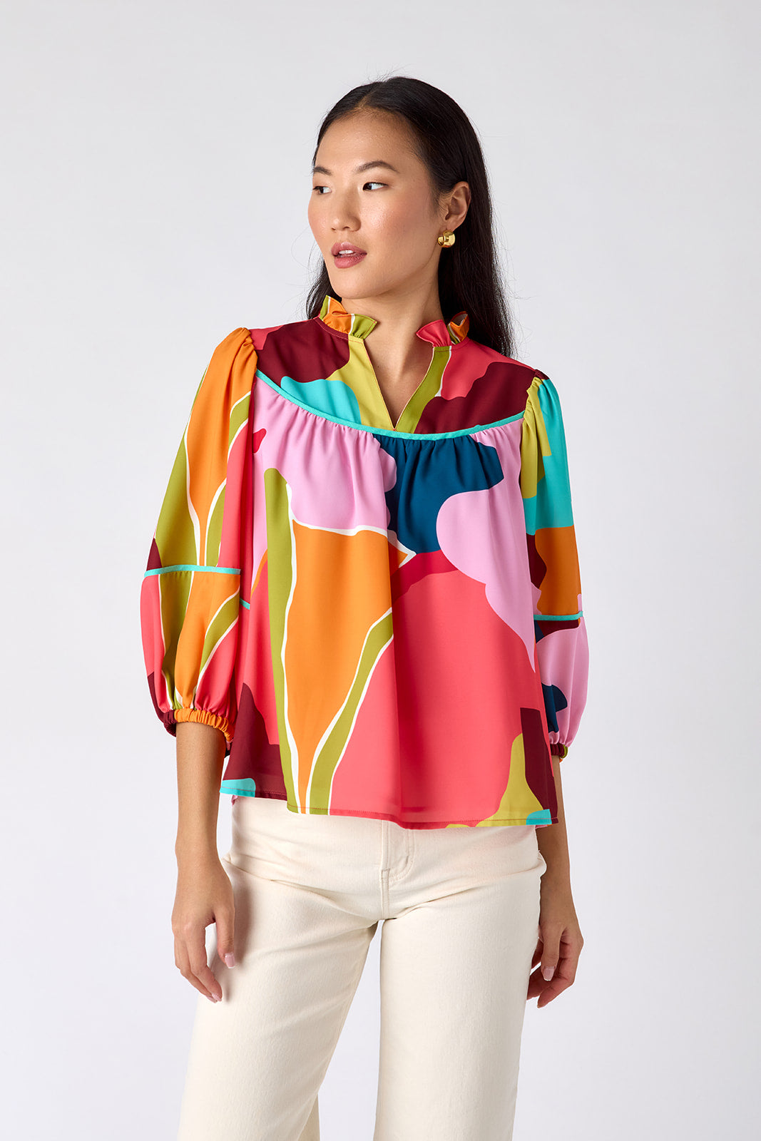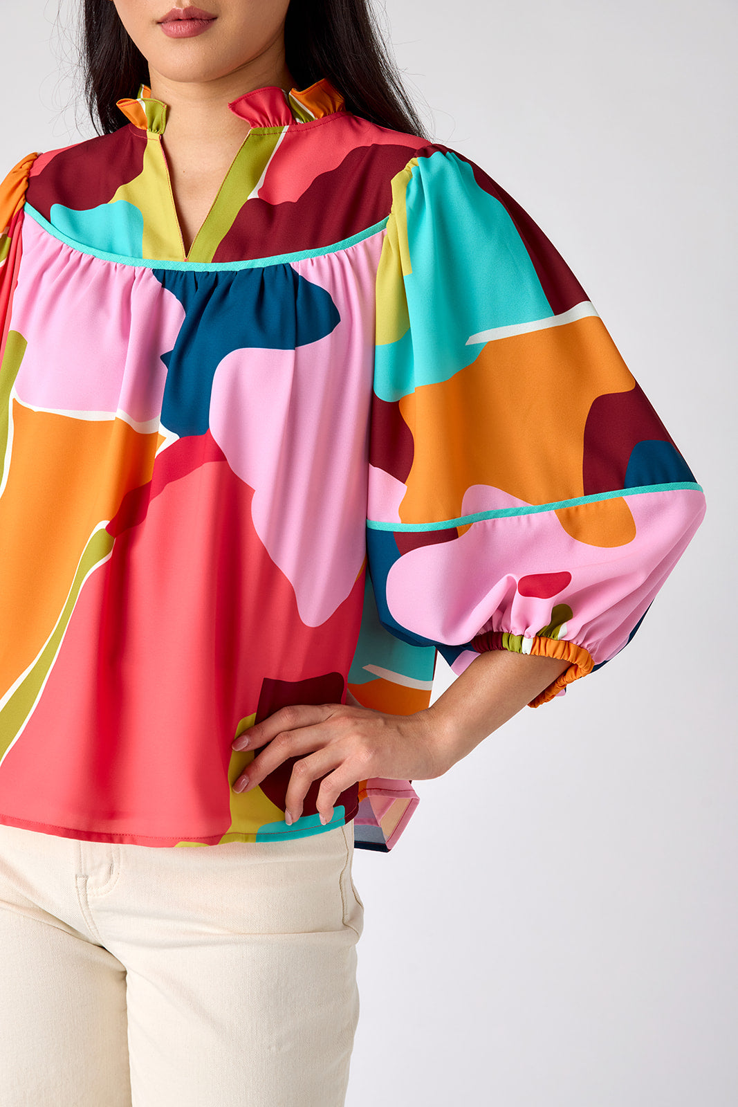 Our Rosie Top features a flattering V-neckline and comfortable, flowy ¾-length puff sleeves. Take her from desk to dinner all season long!
