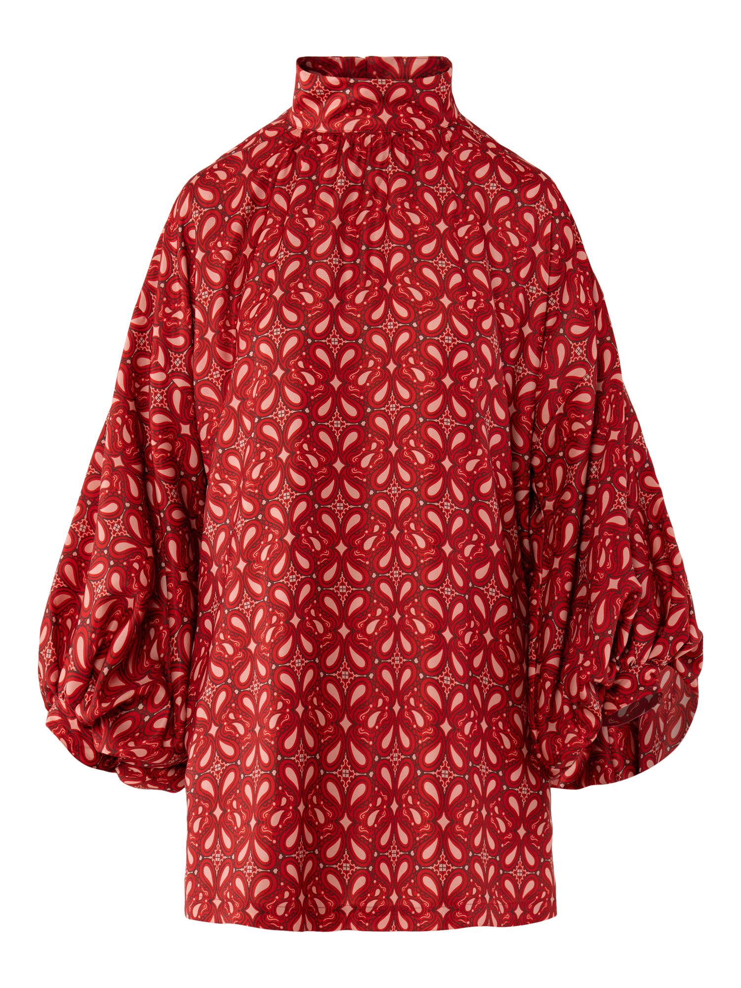The Sasha Mini in Bandana features a high mock neckline and dramatic blouson sleeves that gather at the wrist for added volume and shape. The relaxed body skims effortlessly into a mini-length hem, striking the balance between ease and polish. The bandana print reimagines a timeless motif with bold scale and intricate detail, giving a fresh take on western style. Finished with a subtle back button closure and soft drape, this piece brings statement-making style to any occasion.