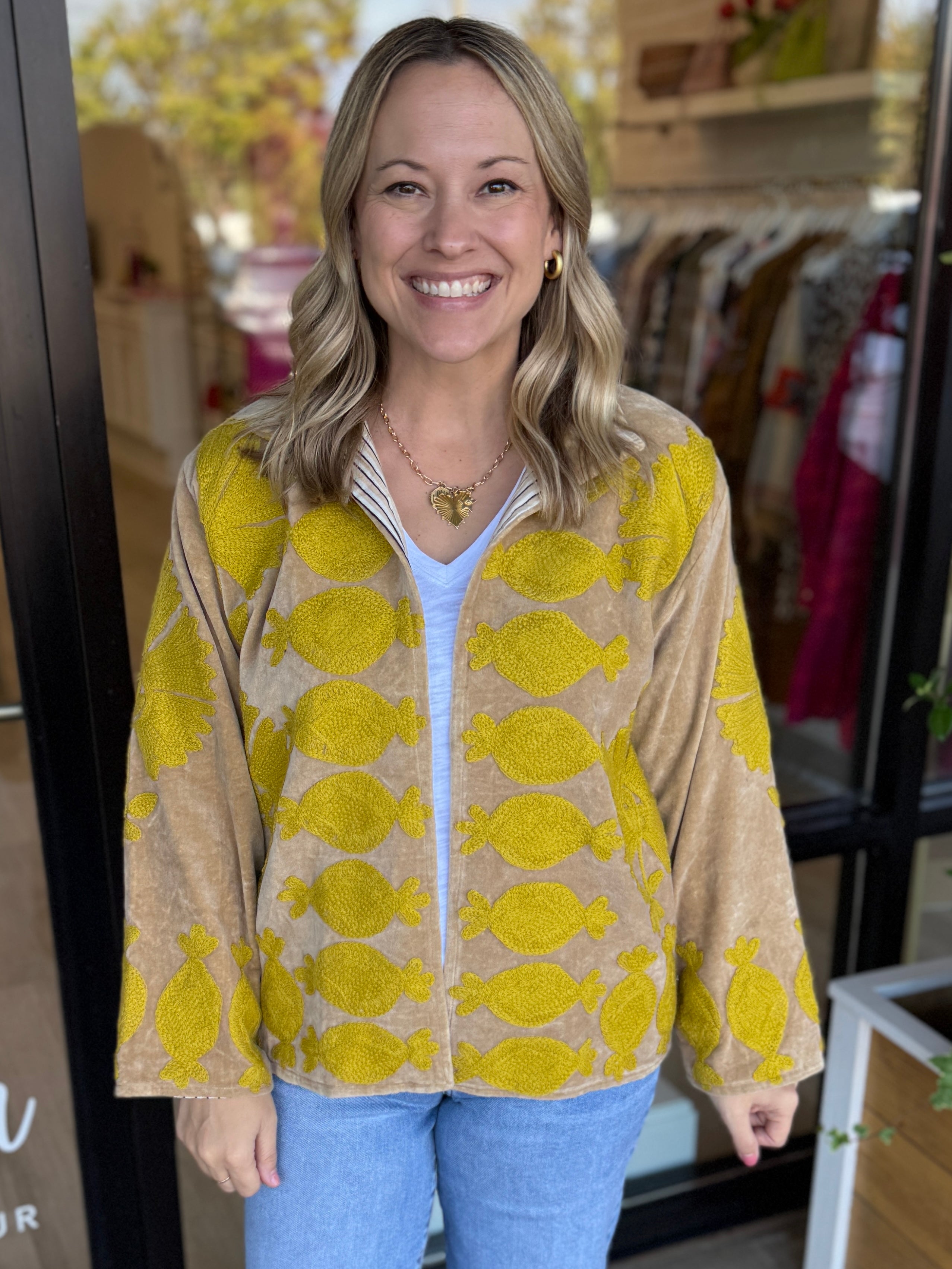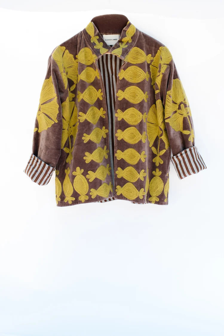 Meet the Crew. Tailored to a flattering hip length, it’s crafted from lustrous velvet and illuminated with hand-finished Suzanni embroidery—an artful interplay of texture, color, and heritage craft. The silhouette balances structure with ease, designed to slip seamlessly from evening affairs to off-duty elegance. A collector’s piece in its own right, this jacket transforms every ensemble into a composition of sophistication and style.