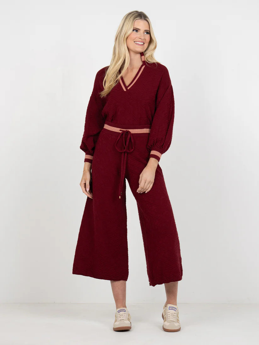 The Teddy Crop Trouser in Merlot Monogram redefines cozy refinement with a branded twist. Designed with a high-rise drawstring waistband and cropped wide-leg silhouette, this style flatters while offering ease of movement. The soft knit features our signature monogram pattern woven throughout, creating a rich textural effect in deep wine tones accented by a subtle blush contrast. Whether styled with the matching Lolli Sweater for a refined set or paired back with a simple top, this piece balances polish and comfort perfectly ideal for travel, lounging, or everyday polish.