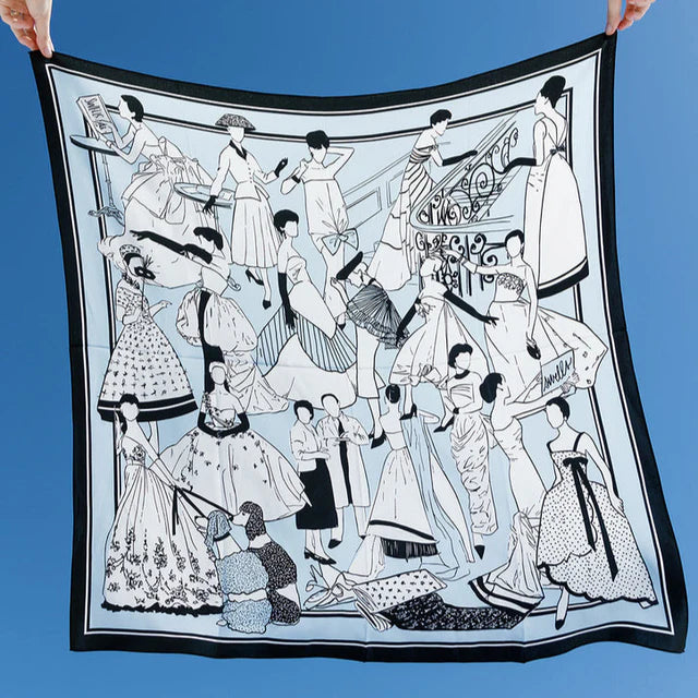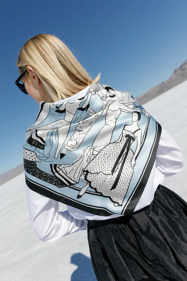 The Couture Scarf: wear the glamour, without the gown. Icy blues and high-contrast hues make up this timeless, 100% silk scarf