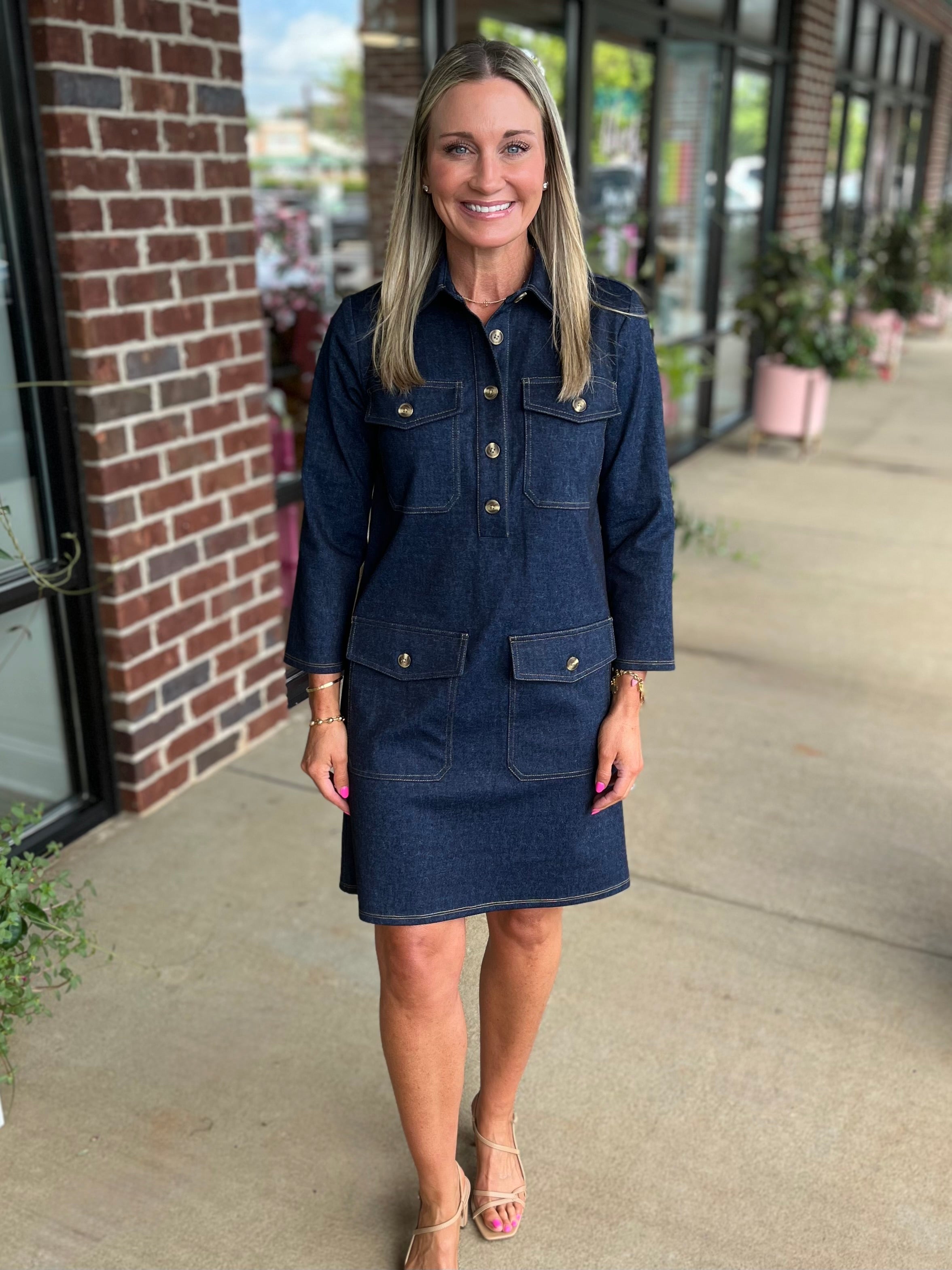 Say hello to Vicky! A new Jude Denim dress designed in a classic shift silhouette with a point collar and long sleeves. This style is both timeless and versatile. The contrast stitching and button-front placket add a pretty touch, making it easy to dress up or keep casual. A true wardrobe staple you will reach for all year long.