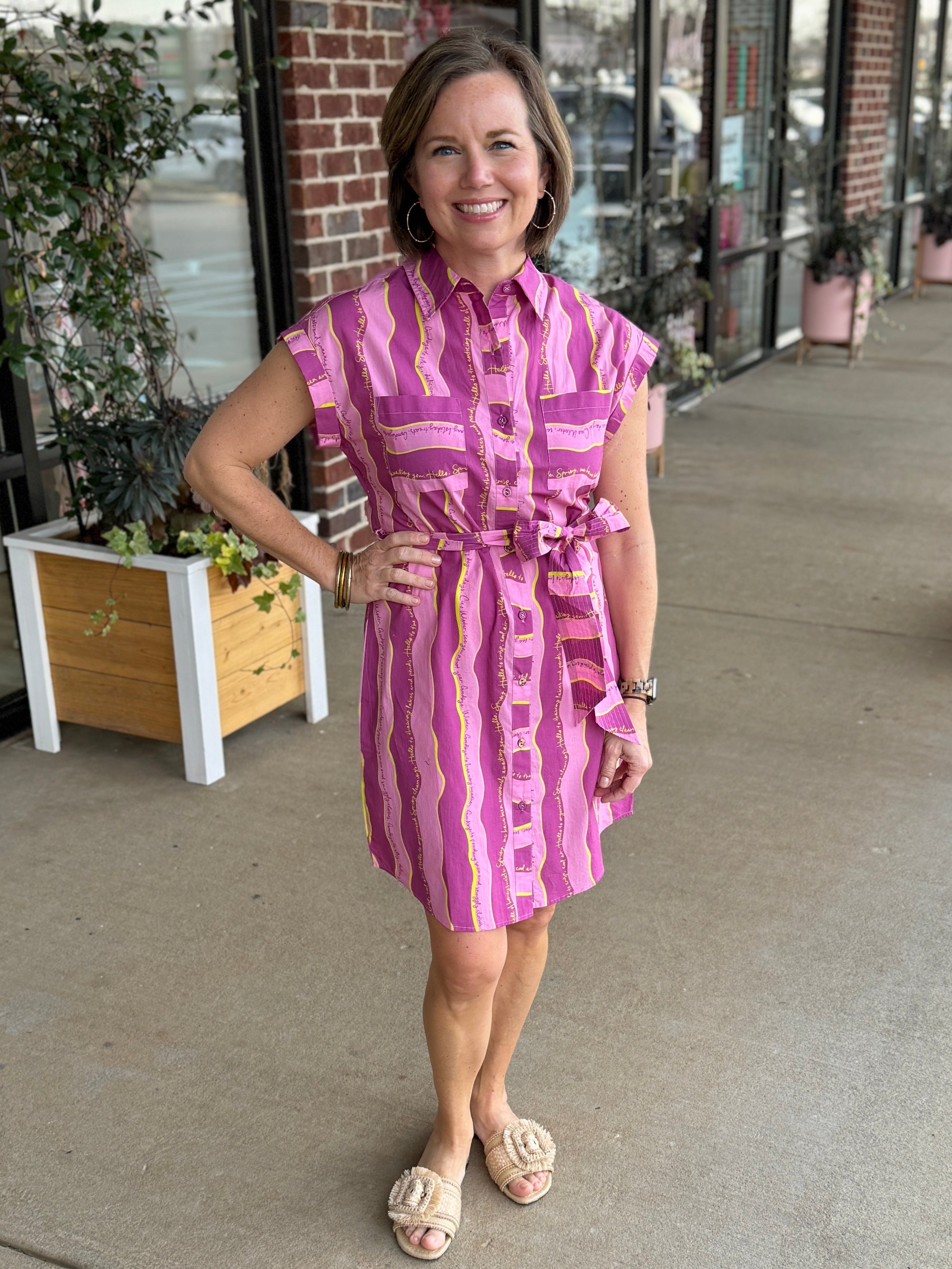 This cotton mini shirt dress features a vibrant striped print featuring a hand written poem by Taylor Bernard. Finished with an optional waist belt for a versatile silhouette, it can be dressed up with strappy sandals or styled casually with sneakers.